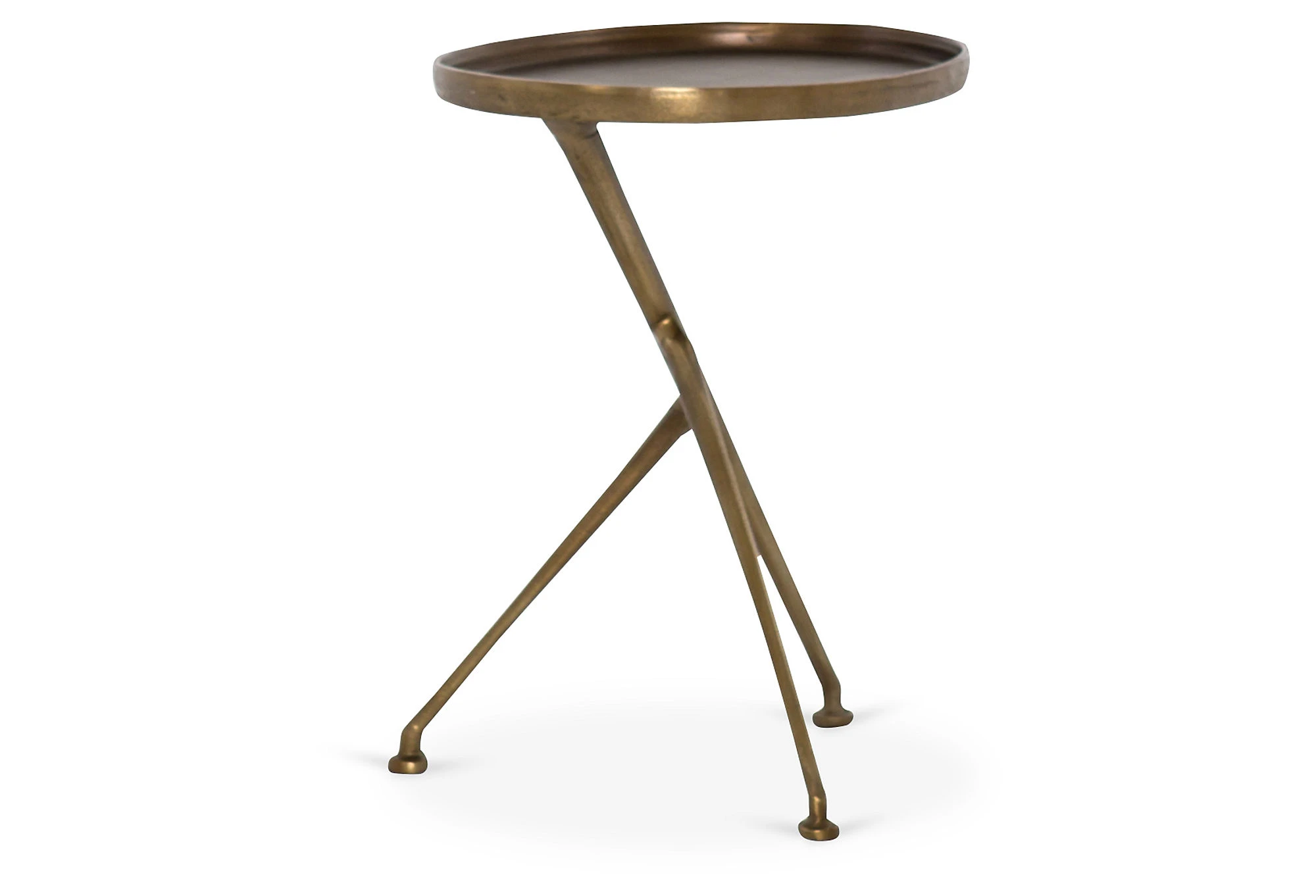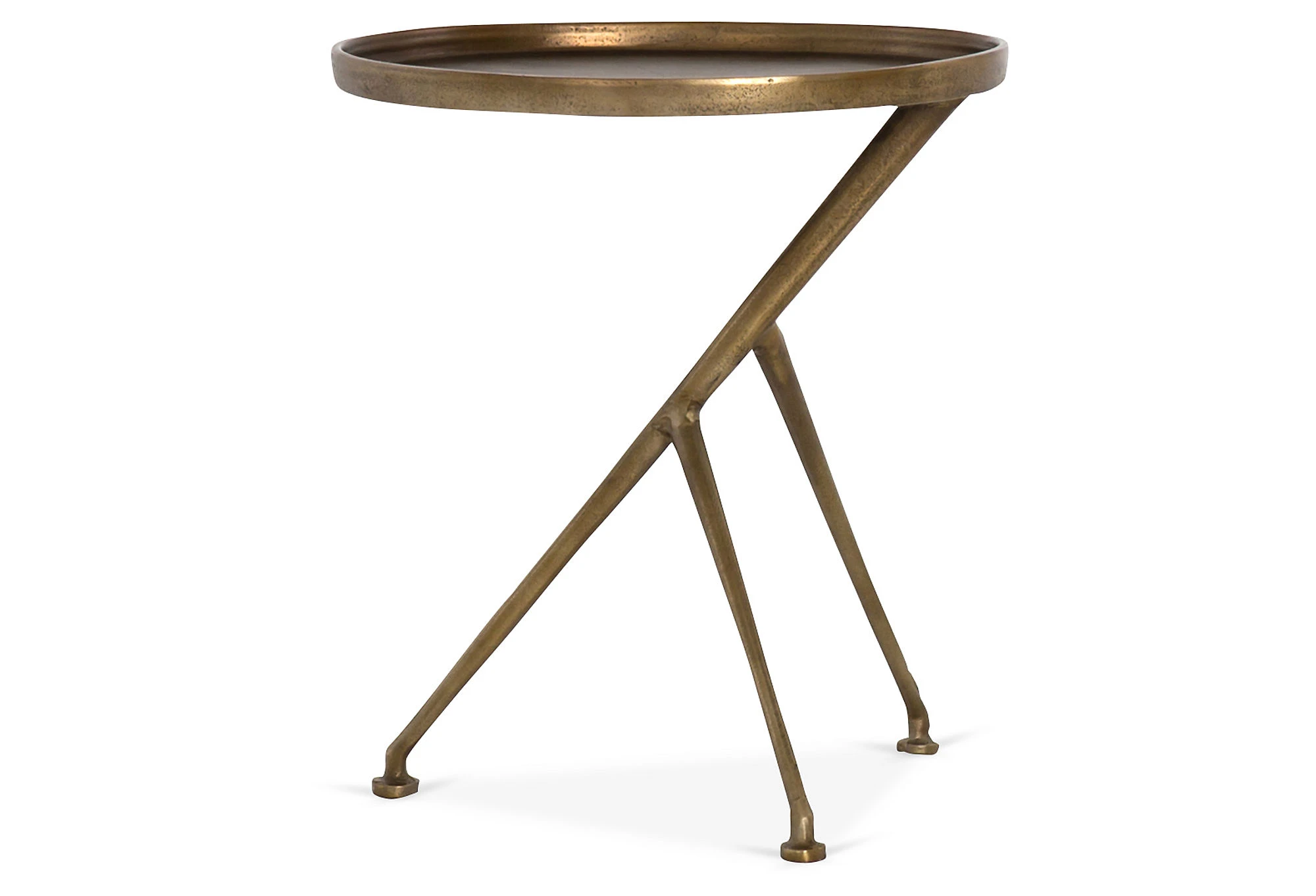A stylish and practical addition to the porch, patio, or deck, this side table is crafted of aluminum with a round galleried top, asymmetrical tripod base, and antiqued brass finish.