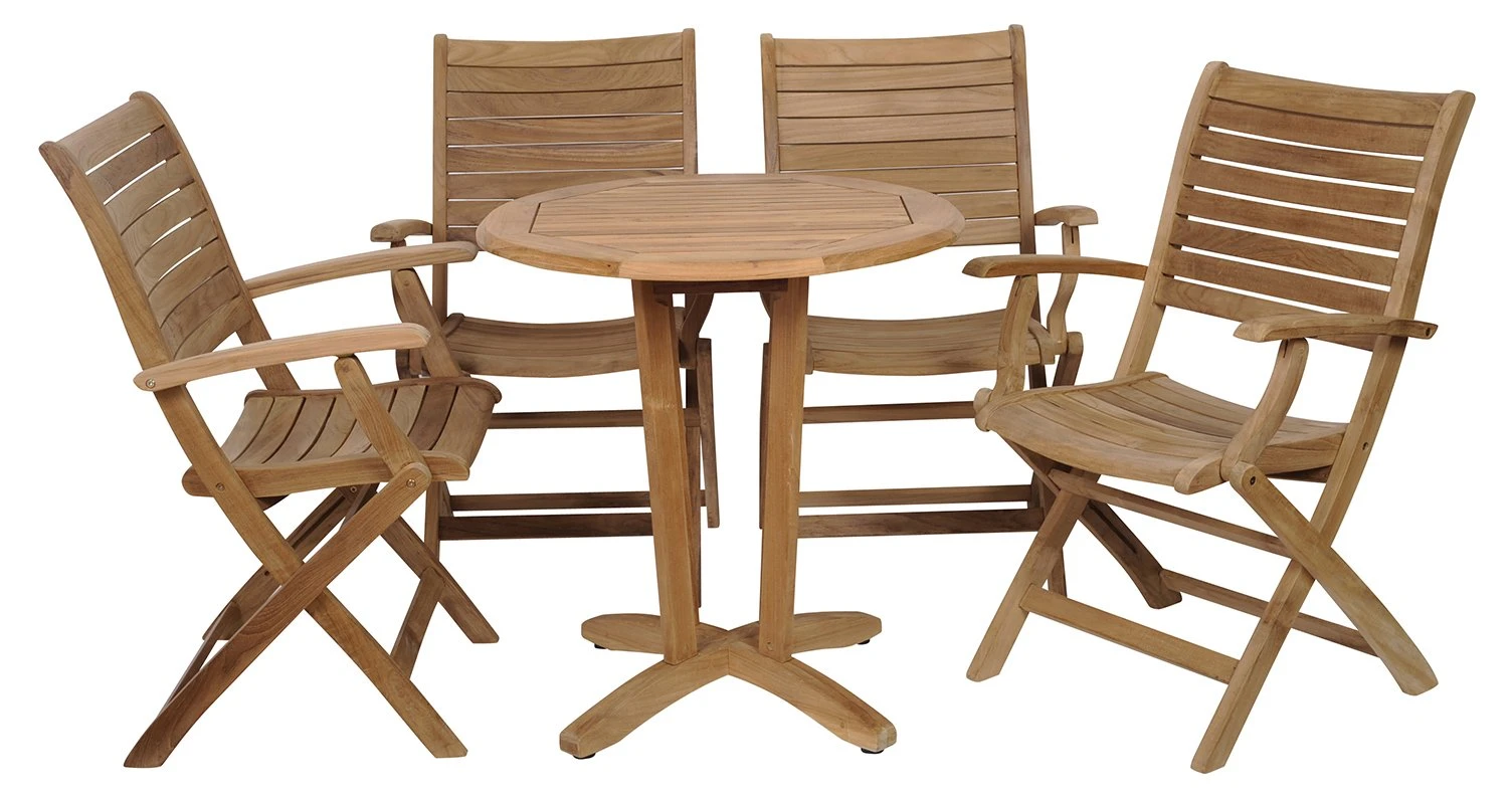 We love the clean, classic look of this set–it will complement nearly any outdoor setting. Crafted from rot-resistant teak, using traditional (and highly durable) mortise-and-tenon joinery, it includes a slatted bistro table and four matching armchairs that fold for easy storage.