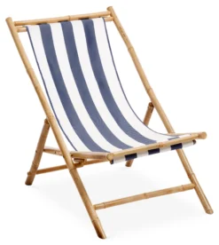 Relax in sustainable style with this artisan-crafted bamboo lounge chair, featuring a striped sling seat, hinged hardware, and locking knife supports. It also folds for easy storage, which is recommended when not in use. Because each item is made using natural materials, minor variations should be expected.