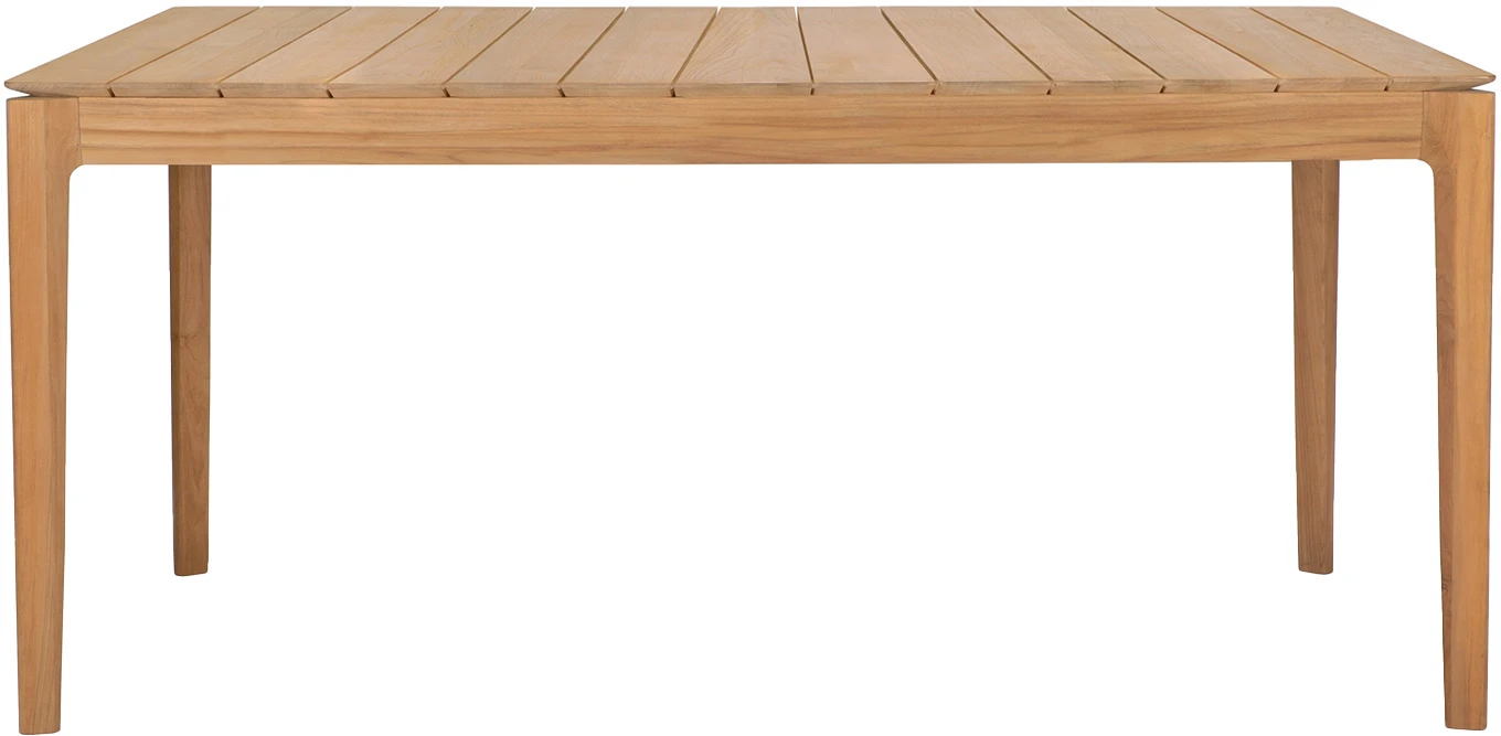 Crafted of teak, a hardwood prized for its resistance to moisture, decay, and even termites, this dining table pairs a slatted top with subtly tapered legs. Durable enough for your patio or deck, it’s also beautiful enough for your dining room or kitchen.