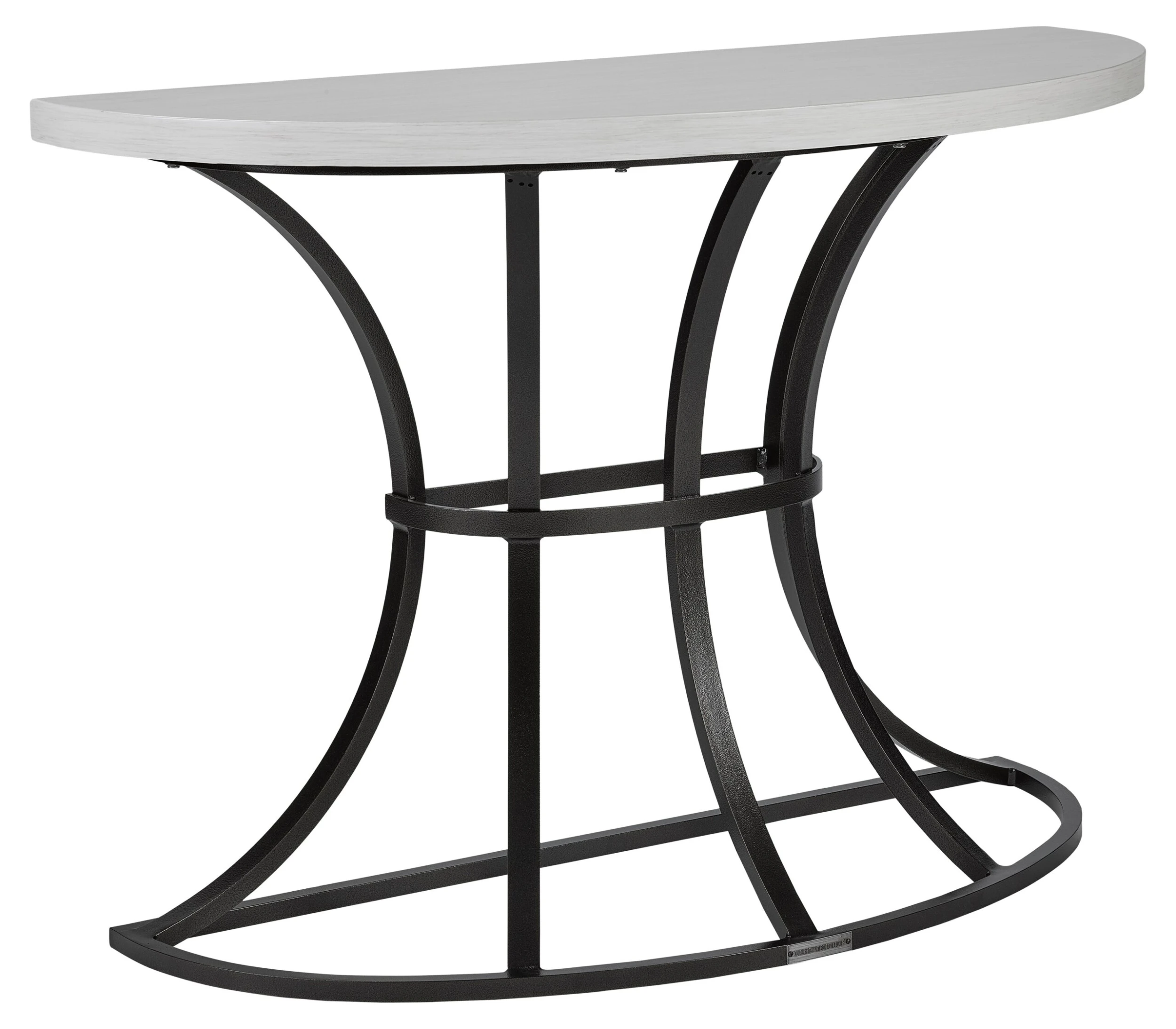 Full of architectural appeal, this outdoor console is crafted of weather-resistant aluminum with structural framework and a demilune top treated to a powder-coated finish that resembles travertine.