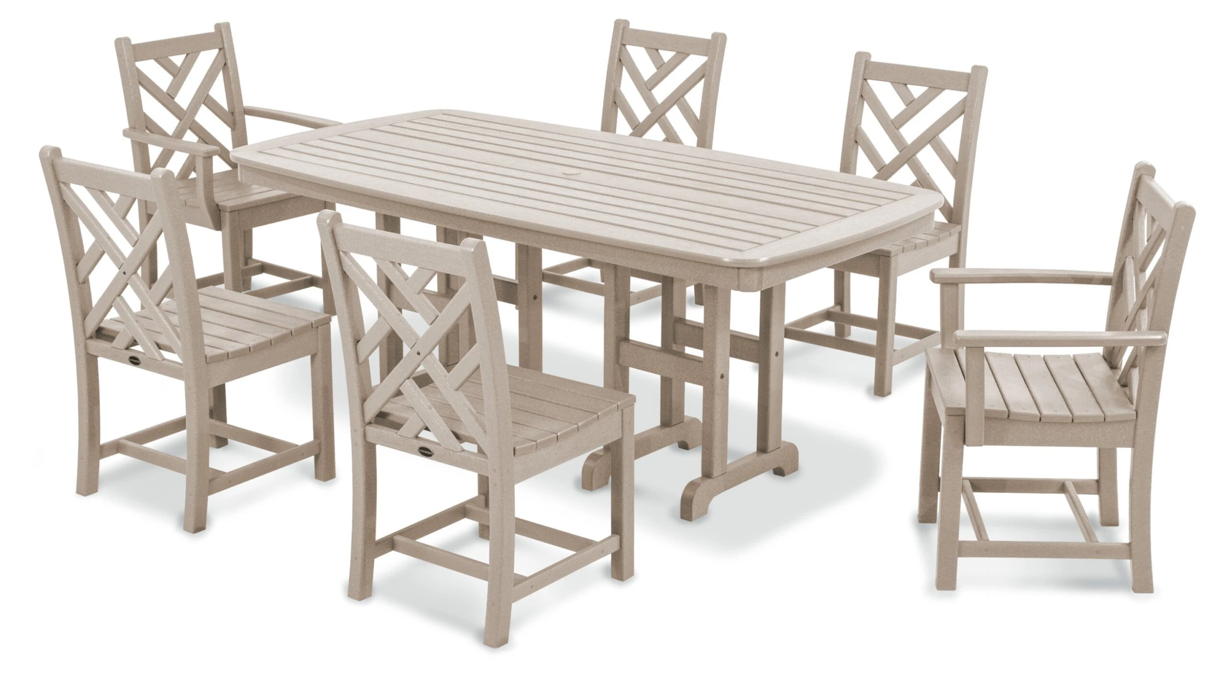 A sturdy and stylish addition to your favorite outdoor space, this dining set is made using Polywood–an eco-friendly, synthetic material that mimics the look of painted wood without any of the upkeep. Fretwork detailing on the chair splats adds visual appeal. Made in the USA.