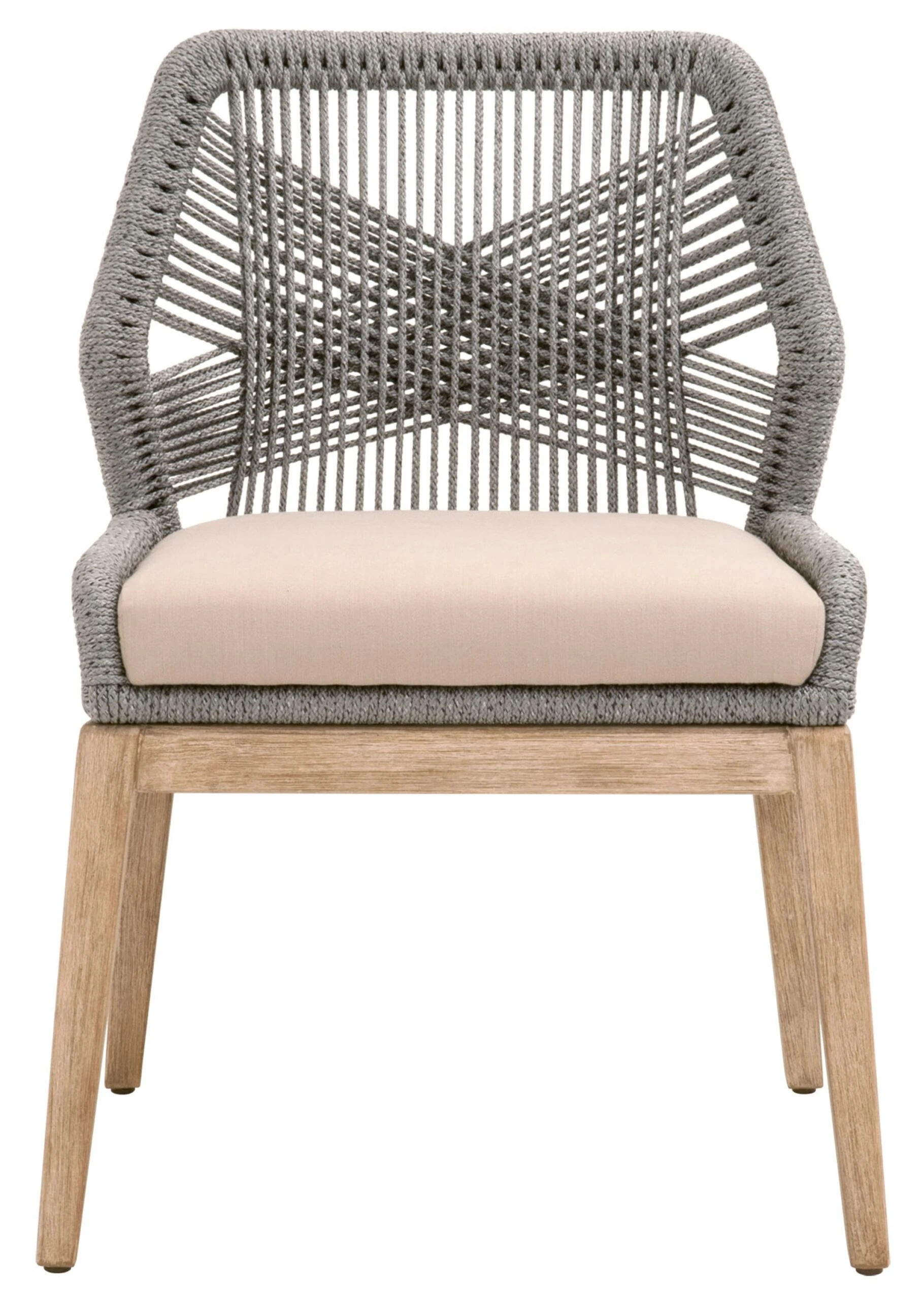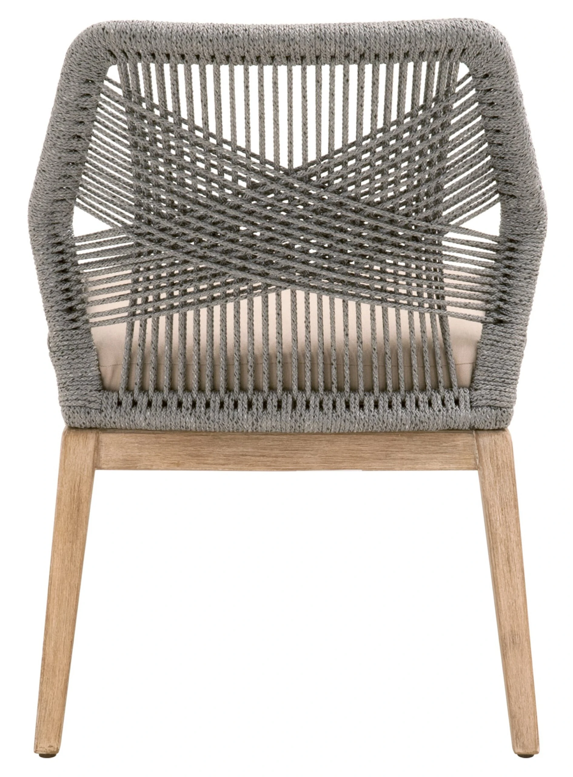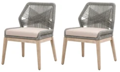 The legs of these side chairs are crafted of mahogany, a hardwood as beautiful as it is durable. The frames are reinforced with aluminum for maximum strength. The intricately woven rope adds artisanal allure, and the amply filled linen-blend seat cushions provide maximum comfort.