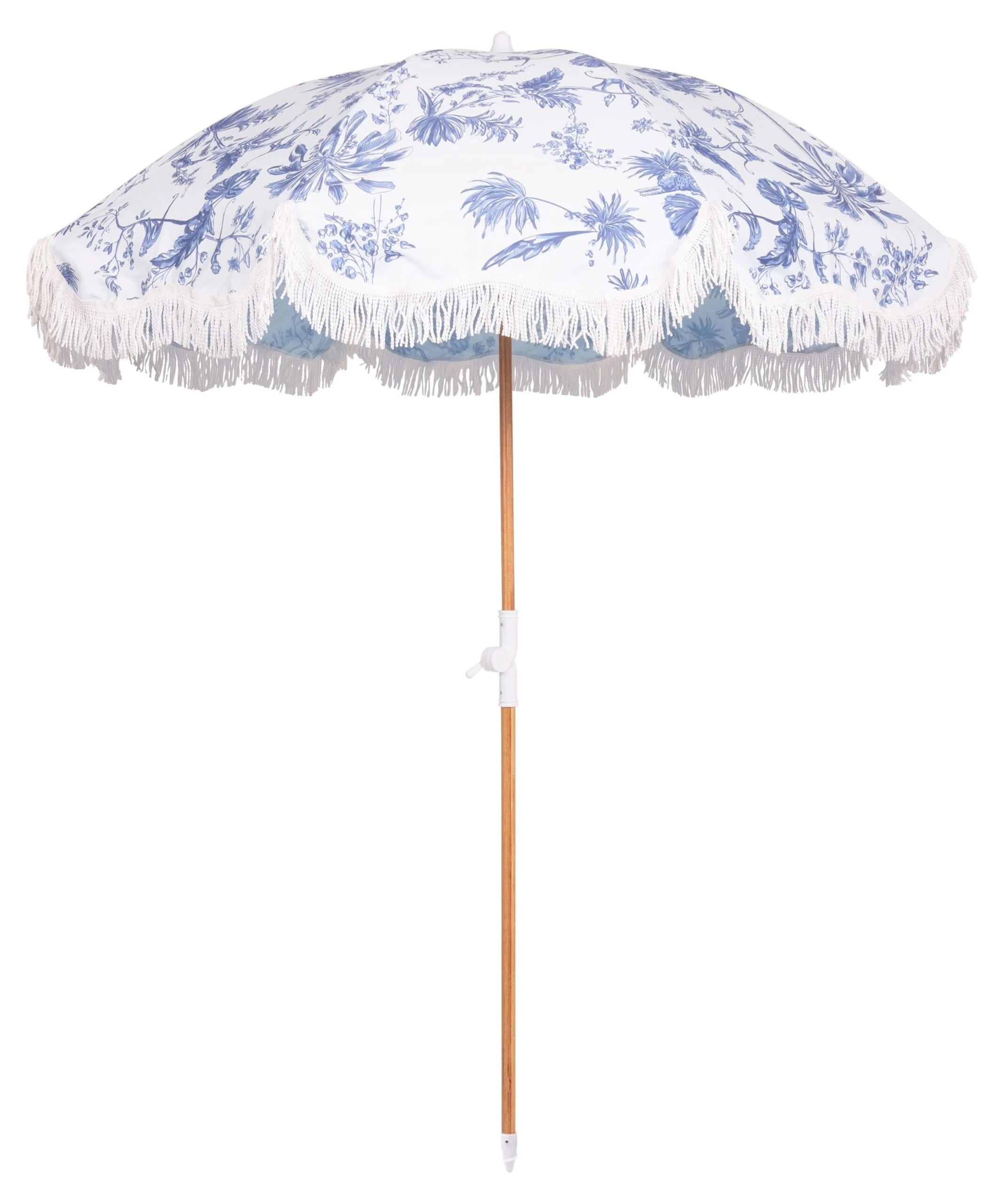 Available exclusively at One Kings Lane: Perfect for the beach, lake, or deck, this lightweight umbrella is designed with a coated canvas canopy that’s conveniently UV- and water-resistant. A collapsible pole makes it possible to tilt to block the sun from any direction and its screw tip bottom helps to anchor it into the sand. Playful cotton fringe completes the look, while a coordinating carrying bag makes it easy to transport.