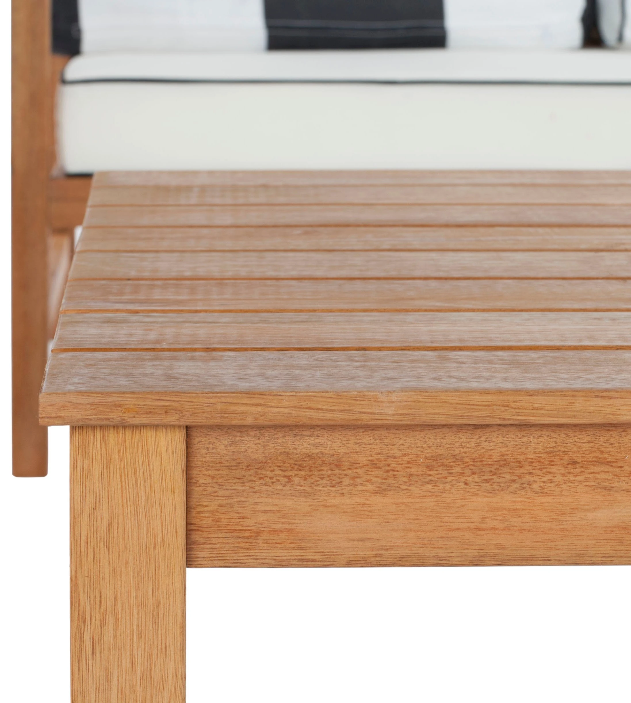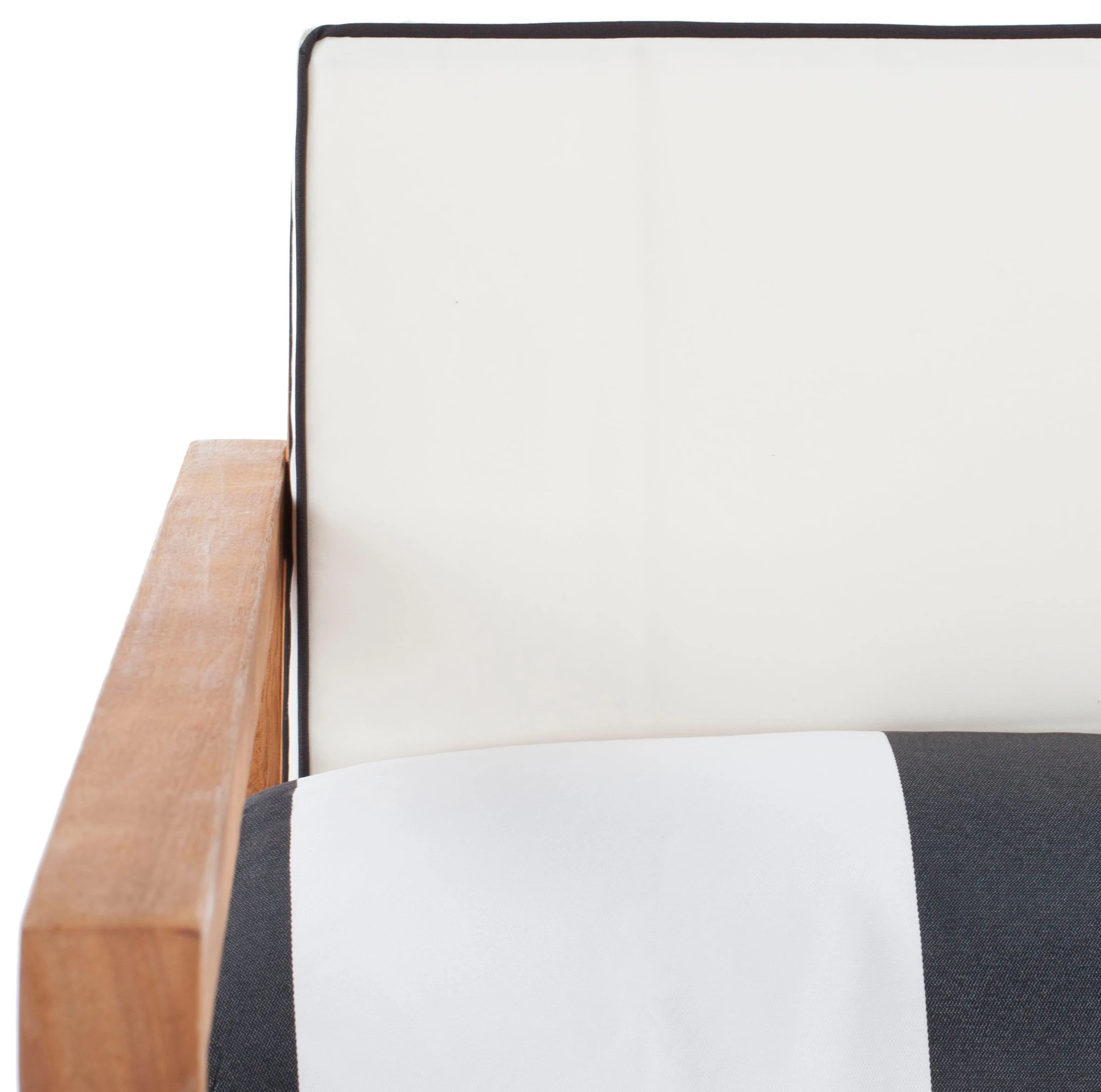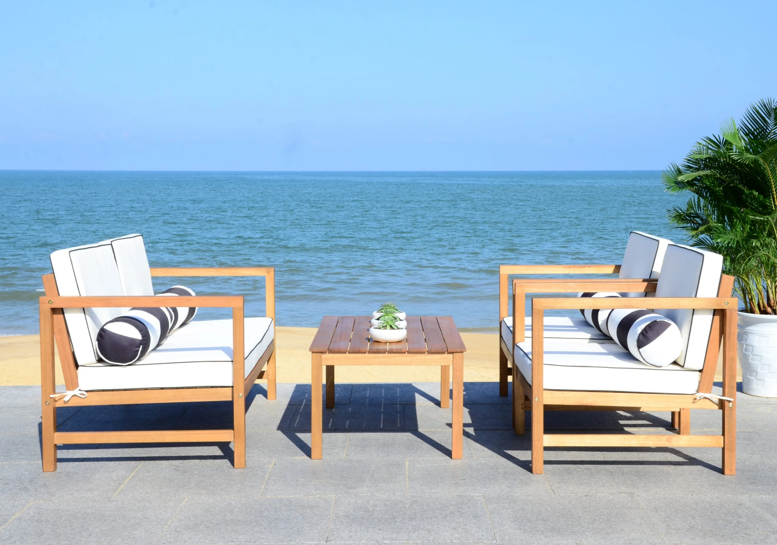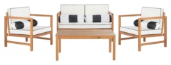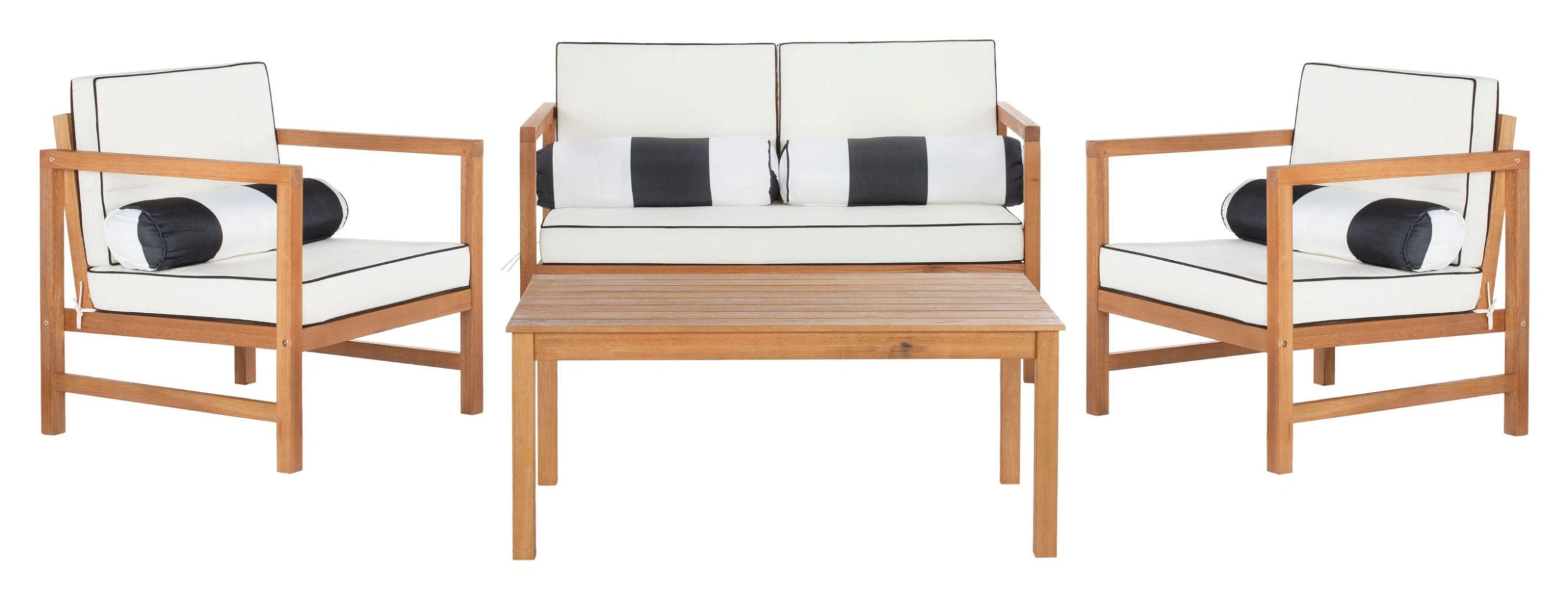 The perfect marriage of form and function, this outdoor lounge set includes a loveseat, coffee table, and two armchairs crafted of eucalyptus with white-and-black weatherproof upholstery amply padded with foam. Four striped throw pillows add a pop of pattern to this design.