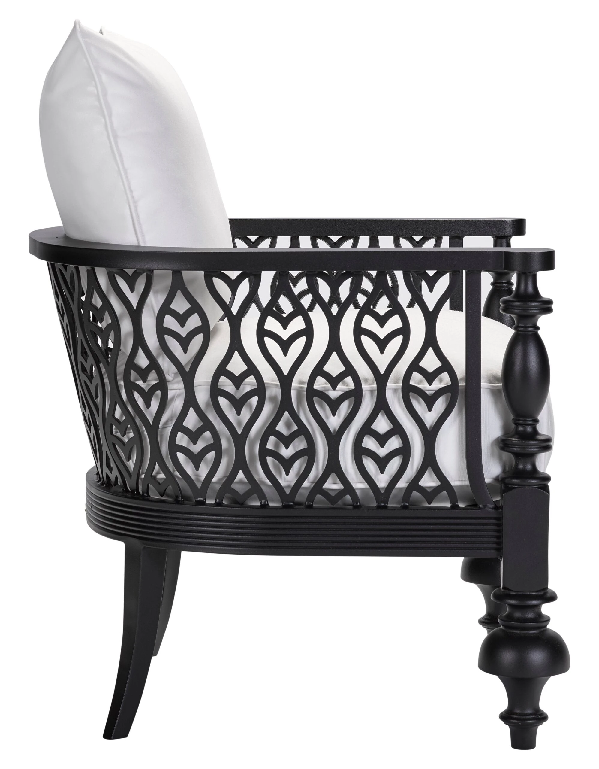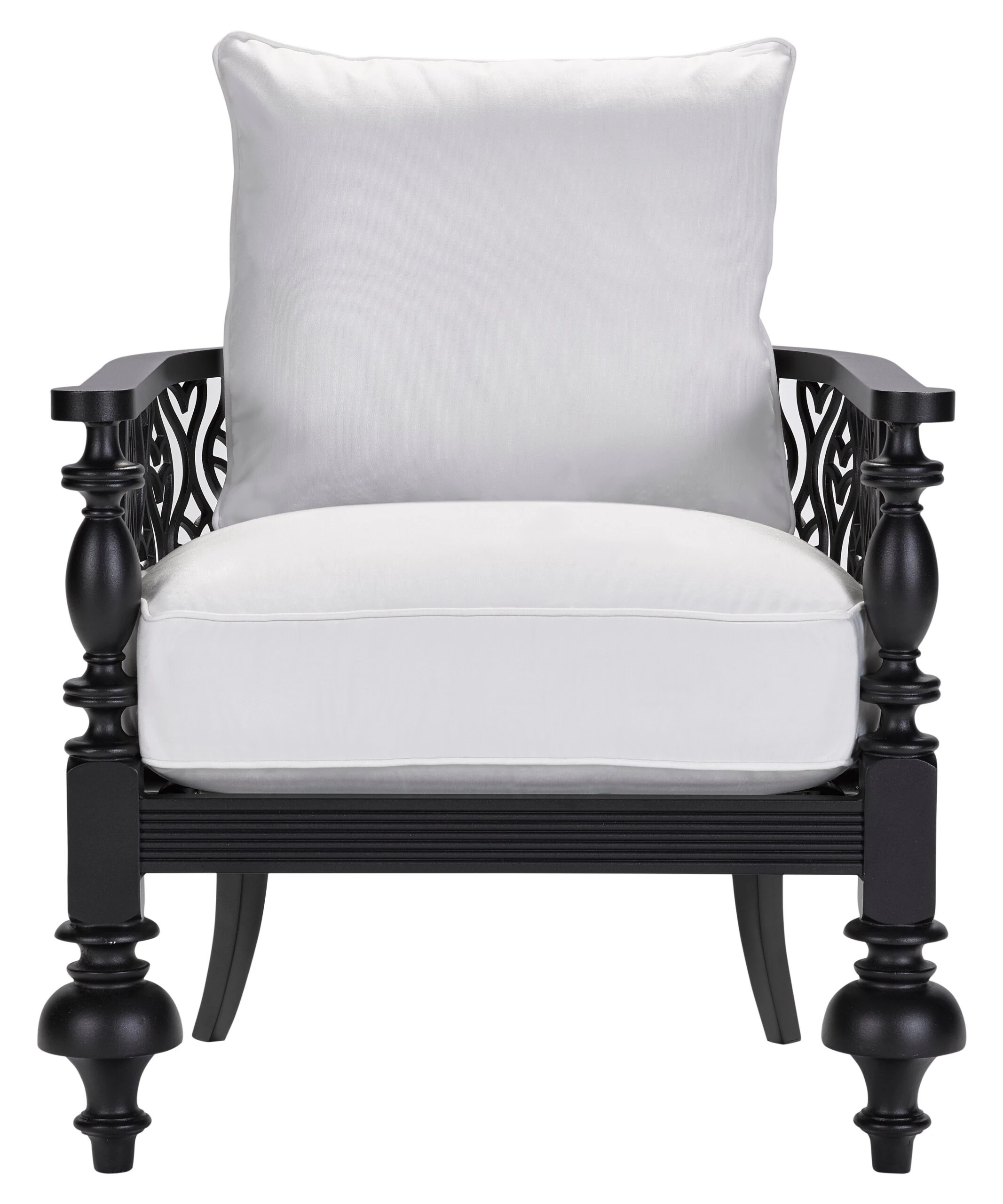 This accent chair makes a stylish and practical addition to your favorite outdoor space with its sturdy all-weather frame accented with elegant carvings and turned front legs. Its amply padded cushions are upholstered in durable Sunbrella–an easy-to-clean, solution-dyed acrylic fabric that is colorfast, mold-resistant, and soil-resistant. We love how the dramatic details give this piece immediate visual impact from every angle.