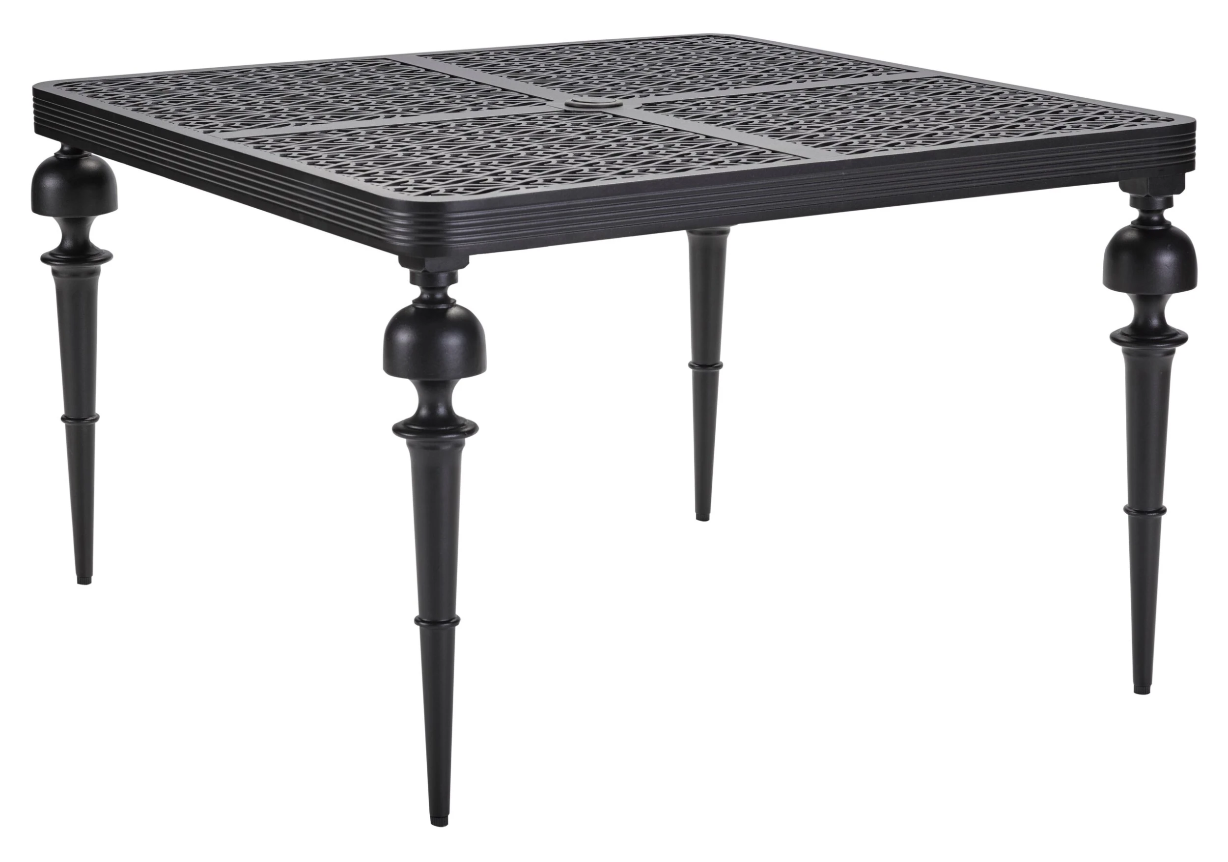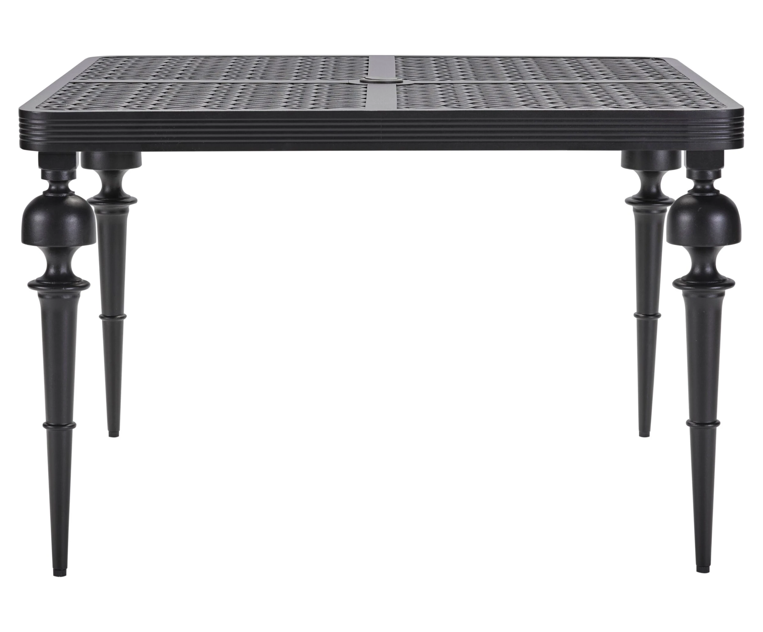 This dining table makes a stylish and practical addition to your favorite outdoor space with its sturdy all-weather frame accented with elegant carved details and turned legs. We love how the dramatic details give this piece immediate visual impact from every angle. The table features a handy cutout in the center to accommodate an umbrella. Comfortably seats four guests.