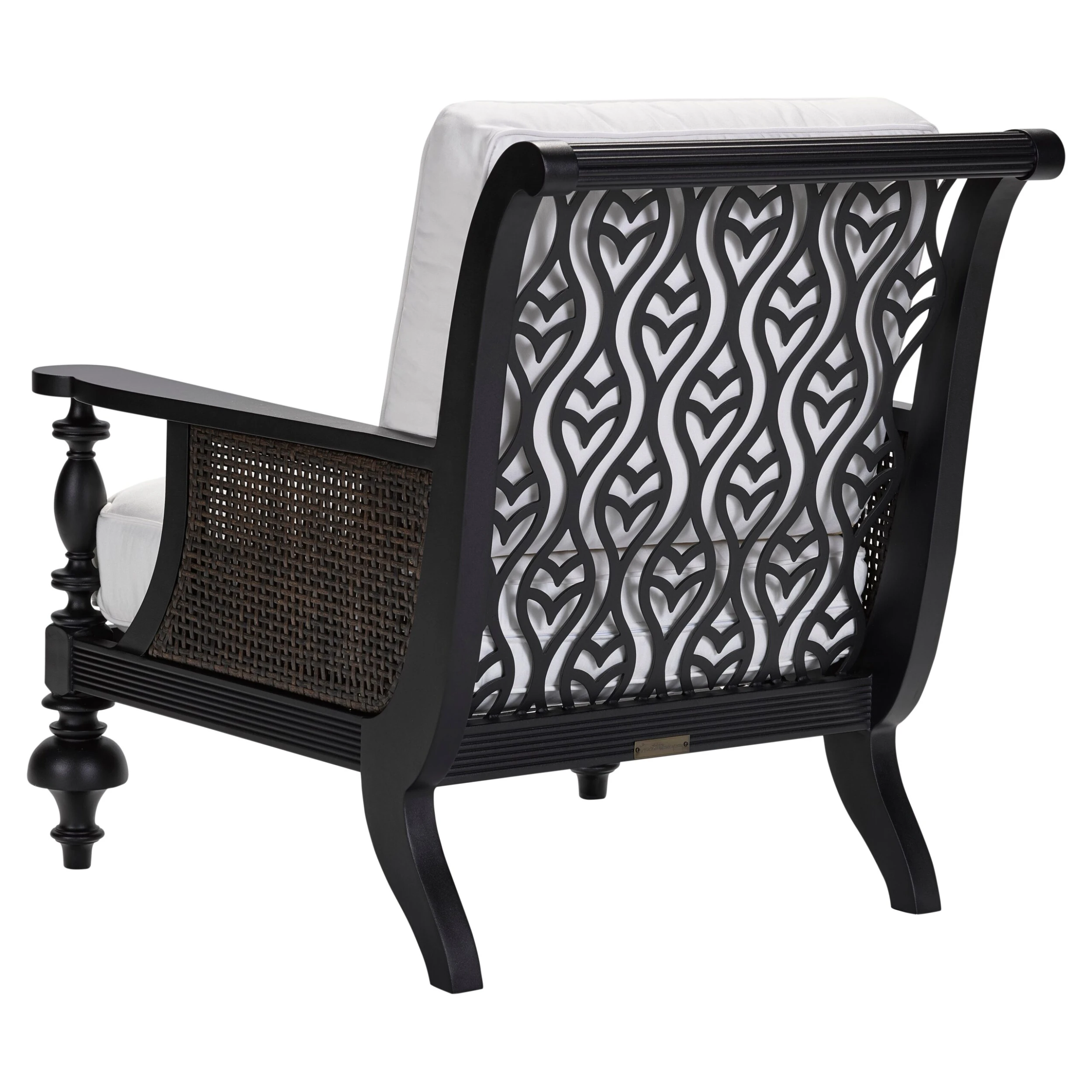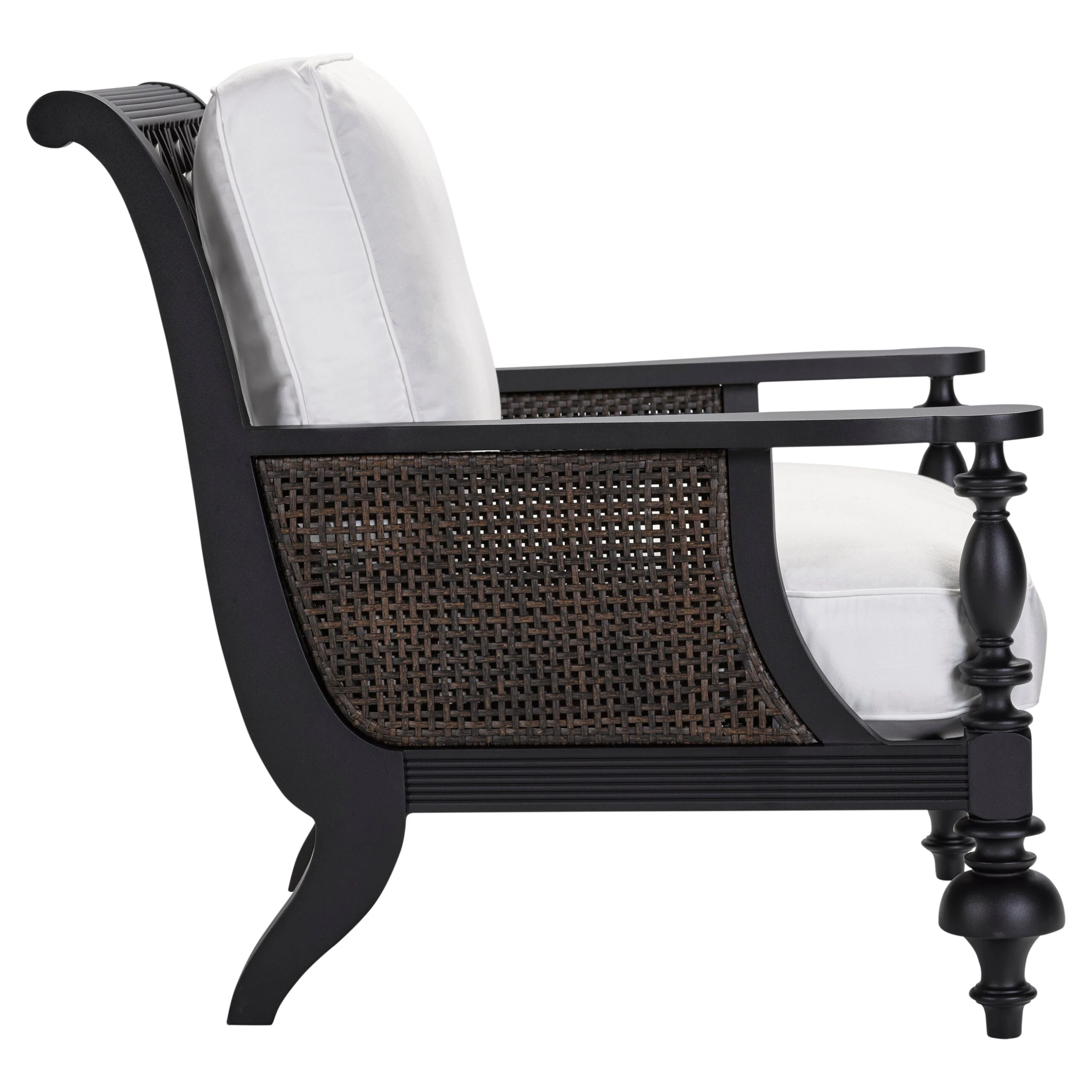 This lounge chair makes a stylish and practical addition to your favorite outdoor space with its sturdy all-weather frame accented with elegant carvings, woven panels, and beautiful turned legs. Its amply padded cushions are upholstered in durable Sunbrella–an easy-to-clean, solution-dyed acrylic fabric that is colorfast, mold-resistant, and soil-resistant. We love how the dramatic details give this piece immediate visual impact from every angle.