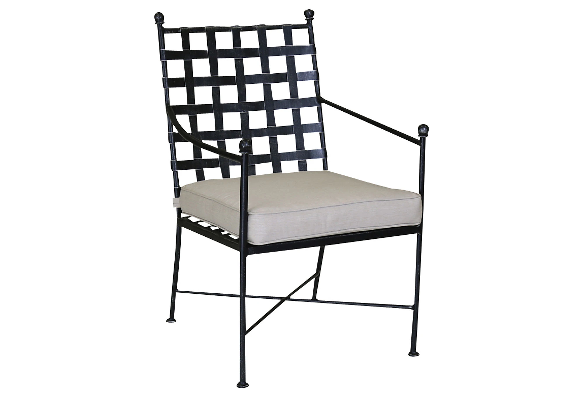 Crafted with a sturdy wrought iron frame and UV-and-moisture-resistant Sunbrella upholstery, this outdoor armchair is built to withstand the elements. Fashioned with a gridded seat back, X-shaped stretcher, and a distressed black finish.