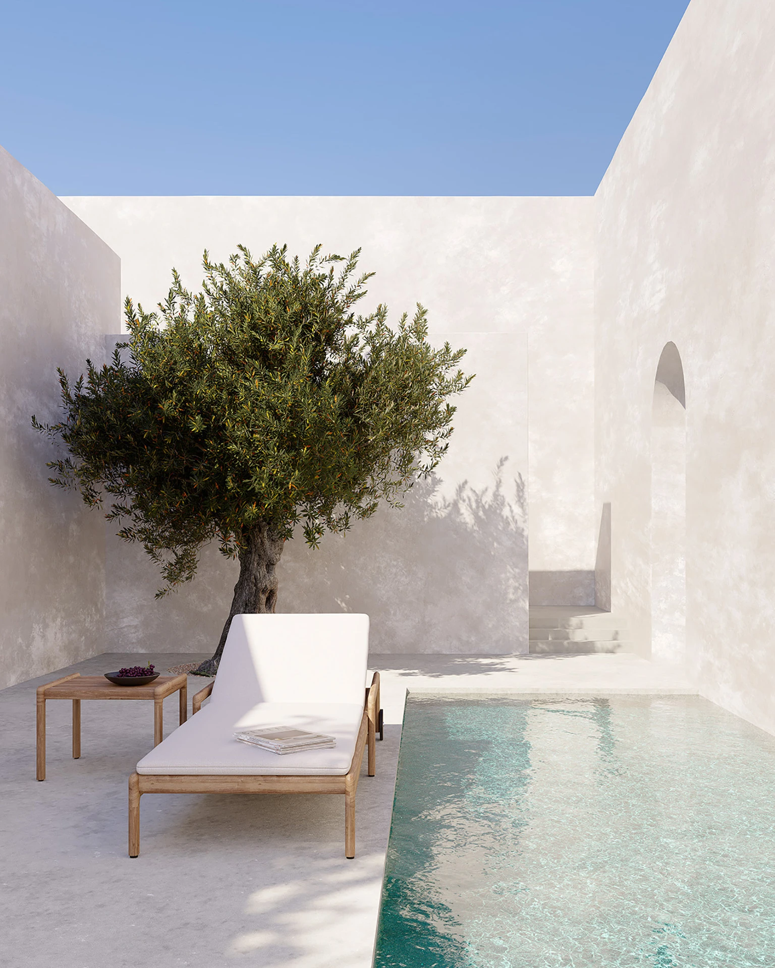 Teak is a hardwood prized as much for its rich grain as for its resistance to moisture, cracking, and even termites. This lounge chair’s smooth surfaces and sleek lines show off the teak’s beauty to perfection. The chaise’s adjustable back ensures optimal comfort, and wheels make it easy to move in and out of the sun. The fabric covering this chaise cushion looks like linen, and in fact it was woven in Belgium. But it’s actually weather-resistant polypropylene. Also weather-resistant—and comfortable—is the quick-drying foam fill.