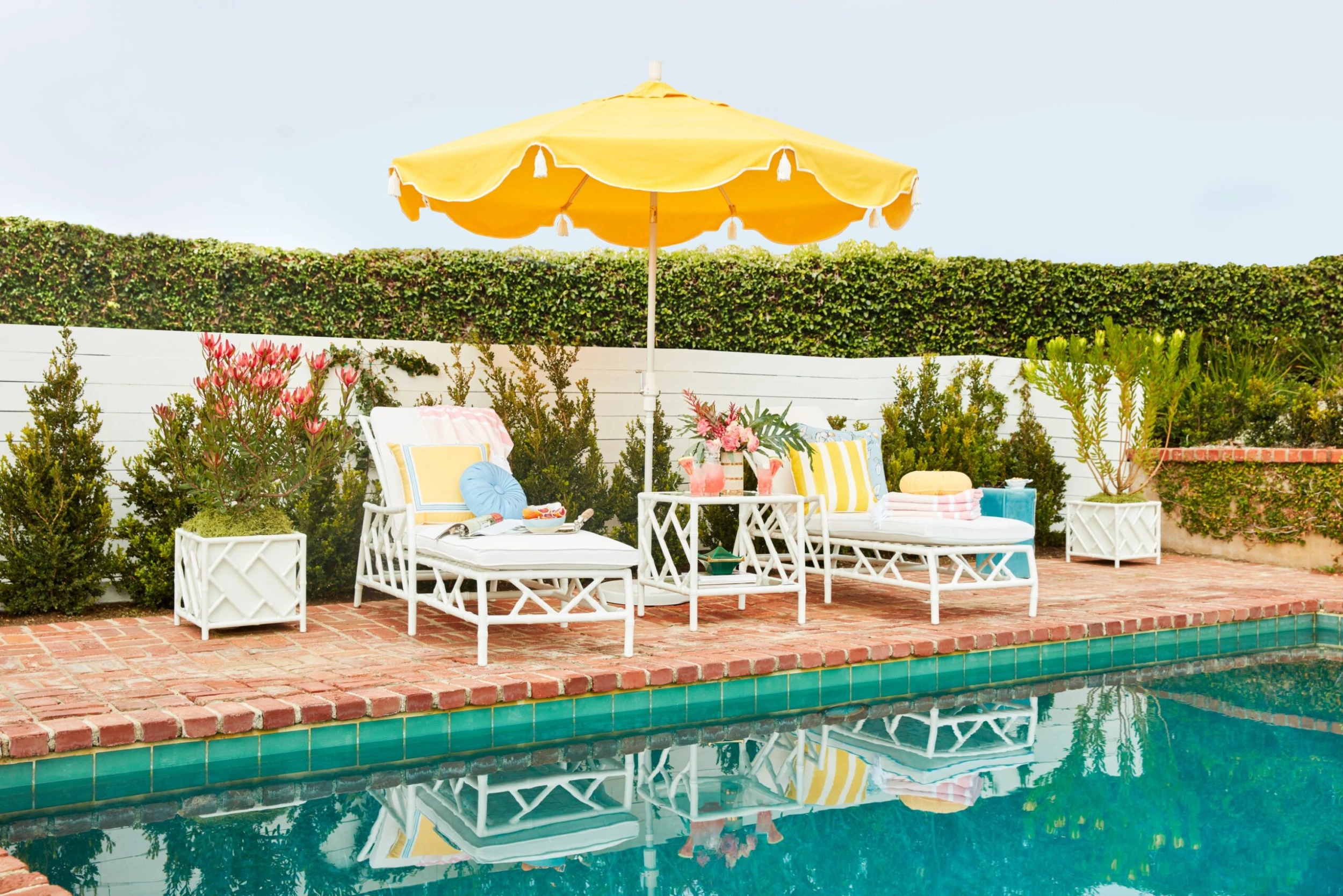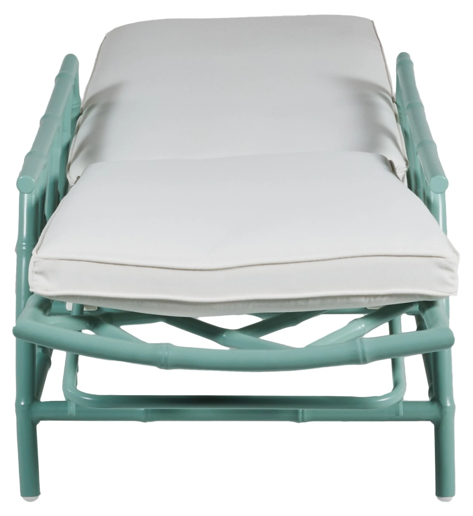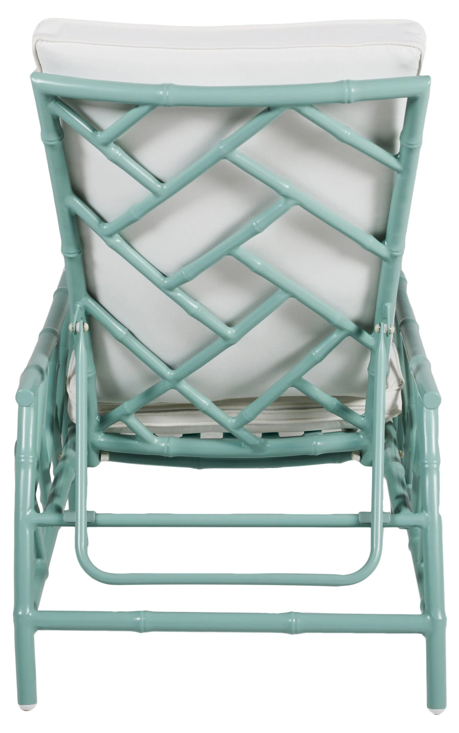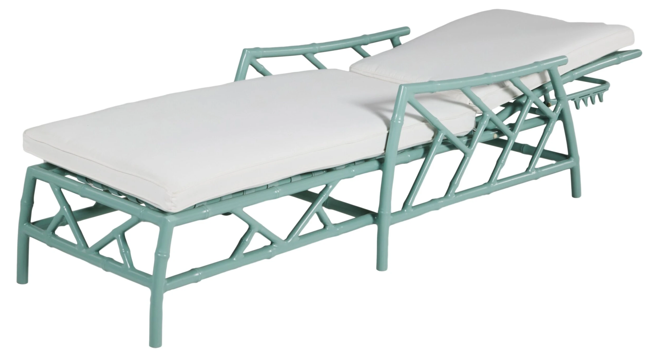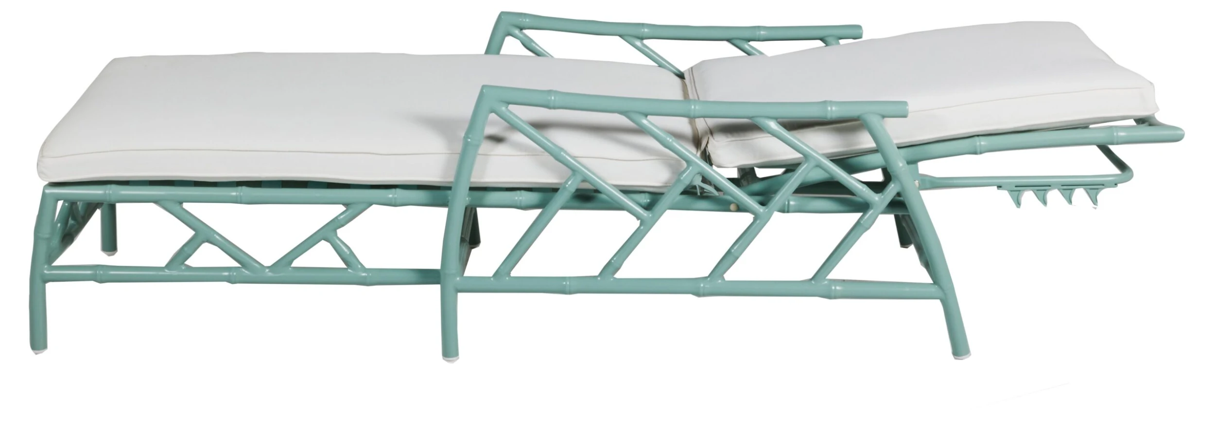 Designed in collaboration with Celerie Kemble exclusively for One Kings Lane: Offering a modern update on classic Chinese Chippendale designs, this outdoor chaise showcases impressive aluminum fretwork with a custom glossy celadon finish and double-welted upholstery filled with foam and fibers. And because each seat cushion is wrapped in durable Outdura–a lightweight acrylic fabric that is colorfast, mold-resistant, and soil-resistant–this piece ensures long-lasting style, comfort, and support. The frame is crafted of wrought aluminum with interior wall supports and galvanized steel inserts, triple-hand-polished 360-degree welds, and a high-solids polyester powder-coated finish. We recommend protecting this item with an outdoor cover or storing it indoors during inclement weather.