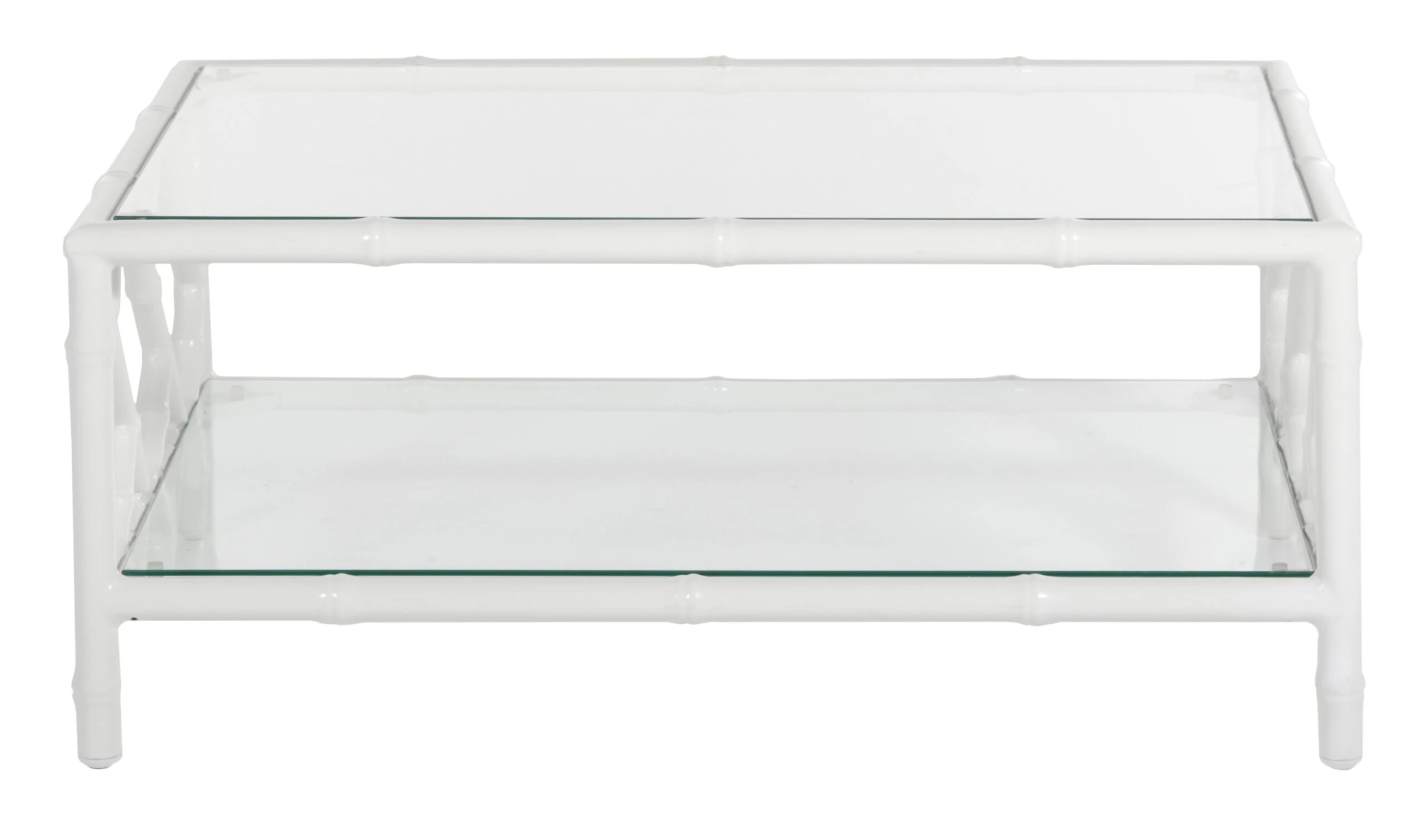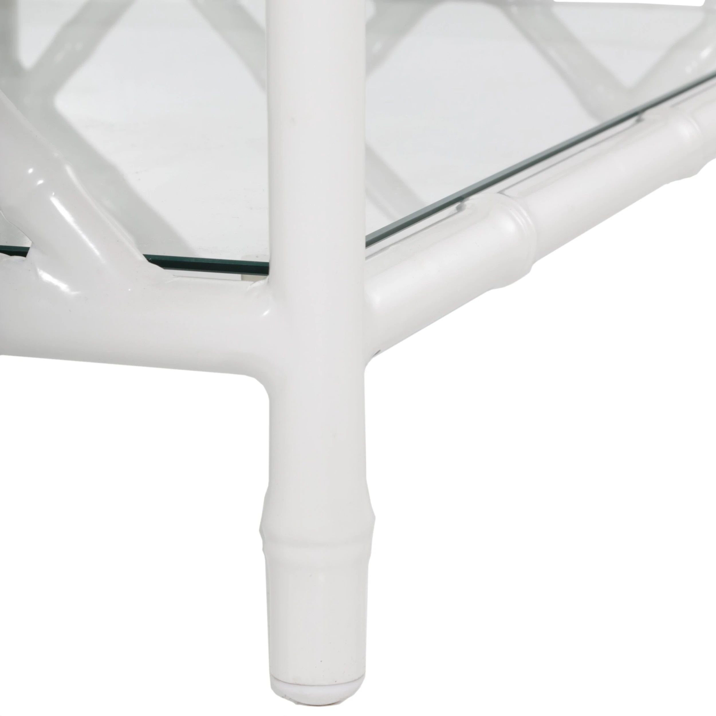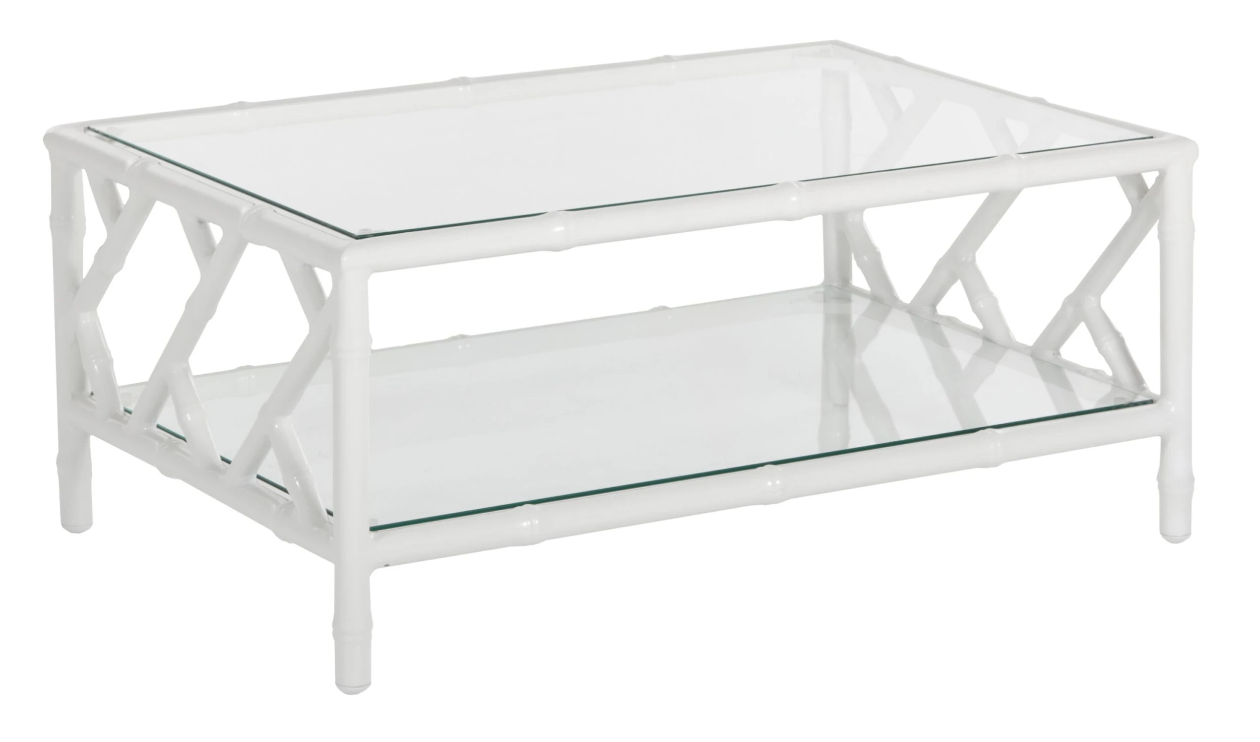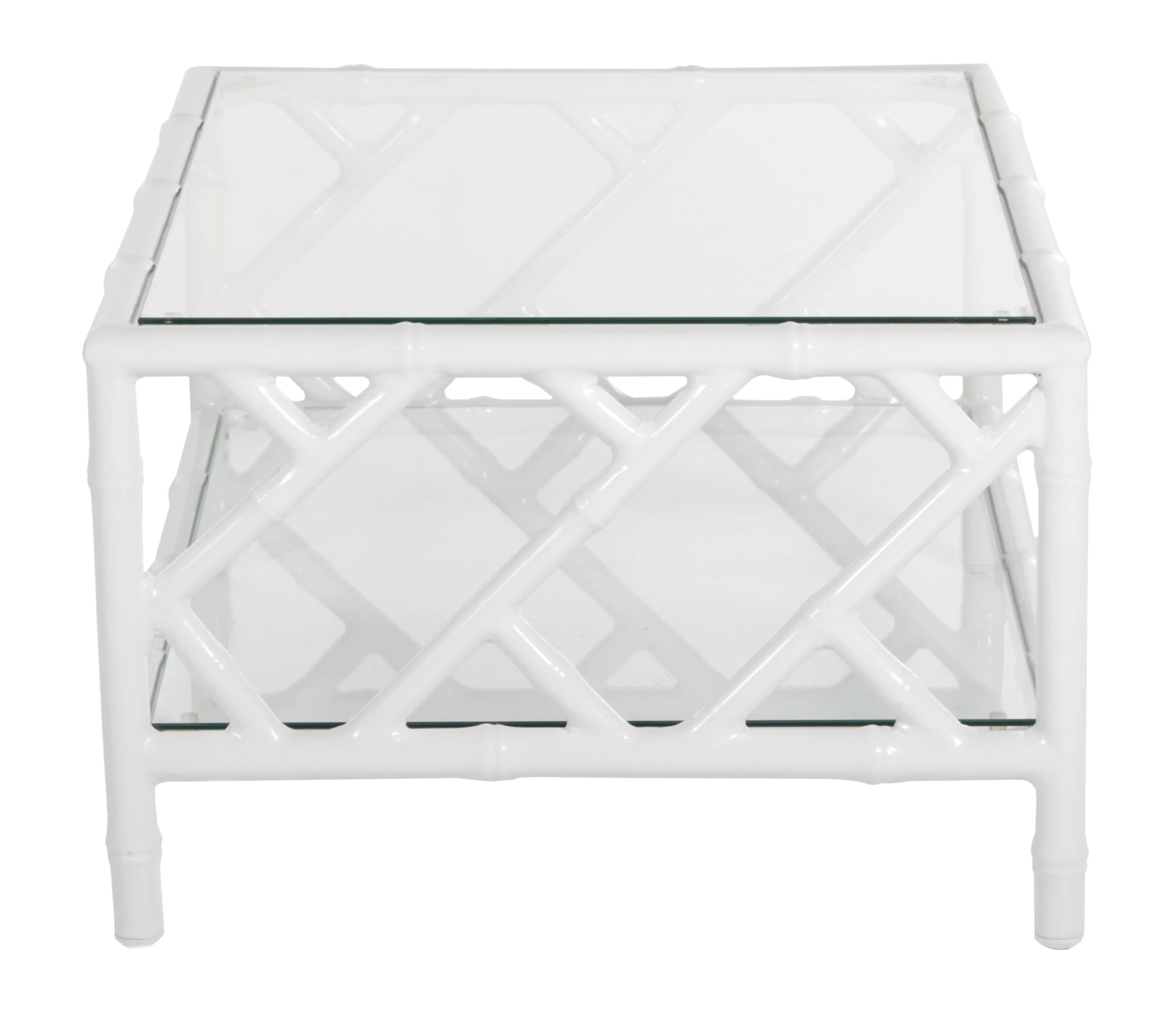 Designed in collaboration with Celerie Kemble exclusively for One Kings Lane: Offering a modern update on classic Chinese Chippendale designs, this outdoor coffee table showcases aluminum fretwork with a glossy white finish. The tempered-glass top and shelf provide plenty of sturdy space for resting drinks and stashing sunscreen, magazines, and other must-haves.