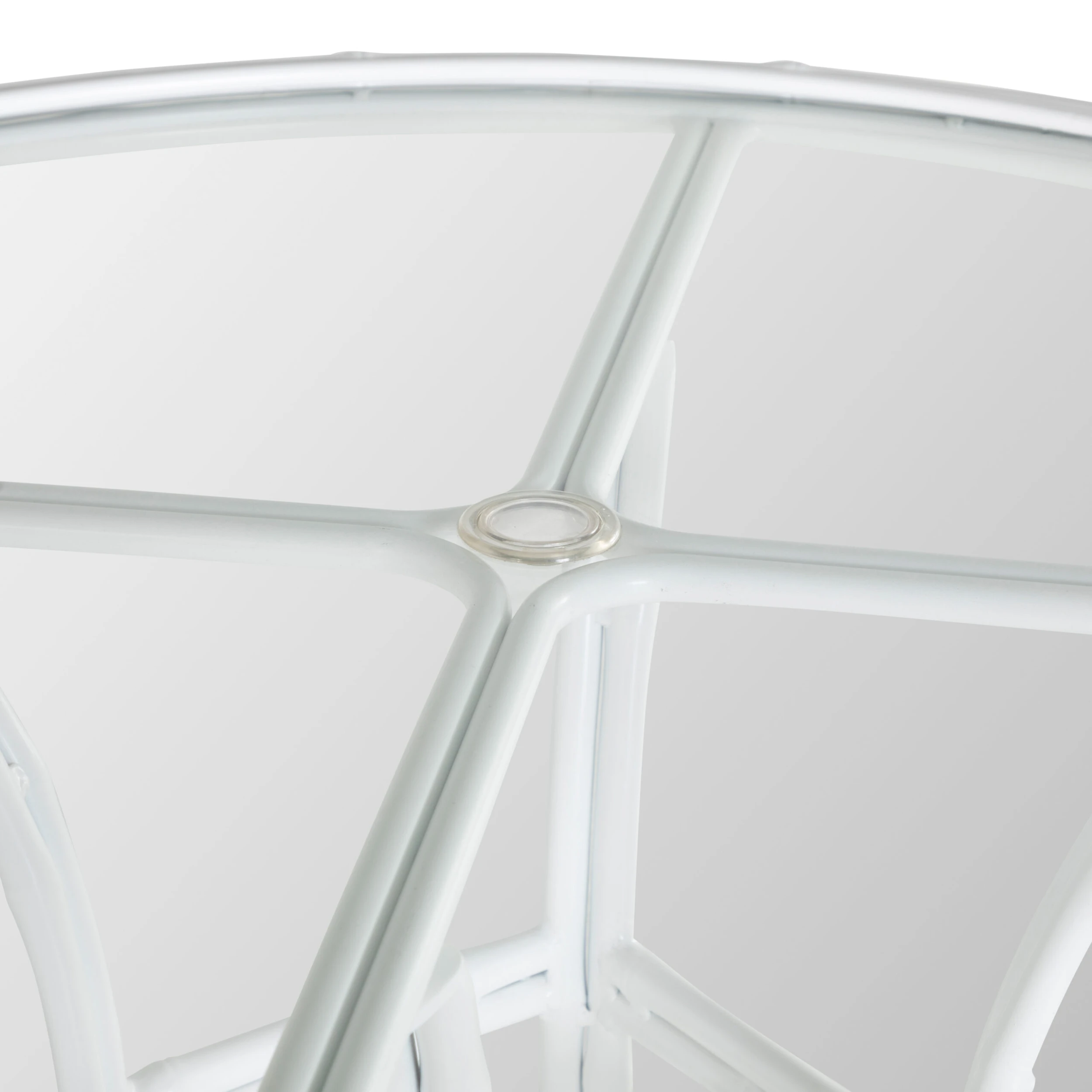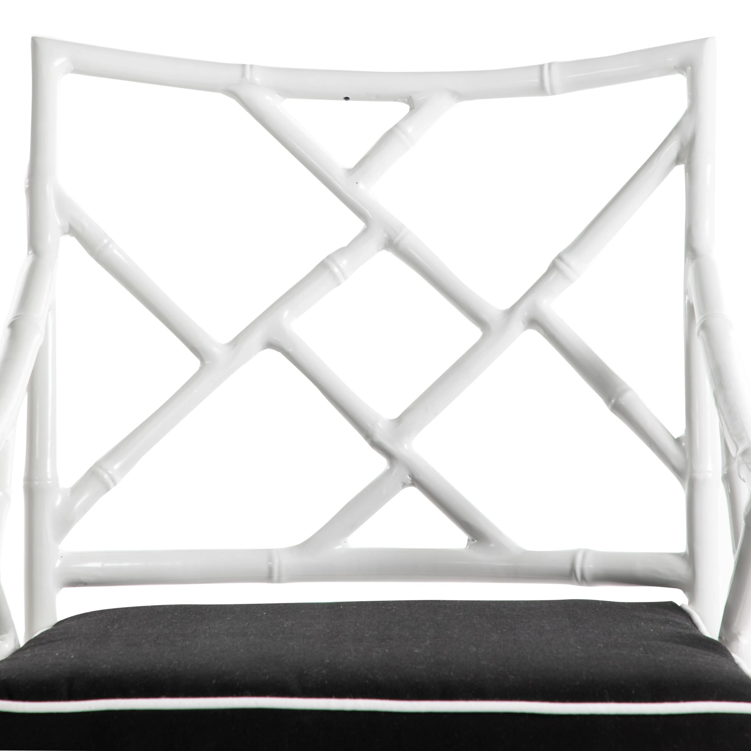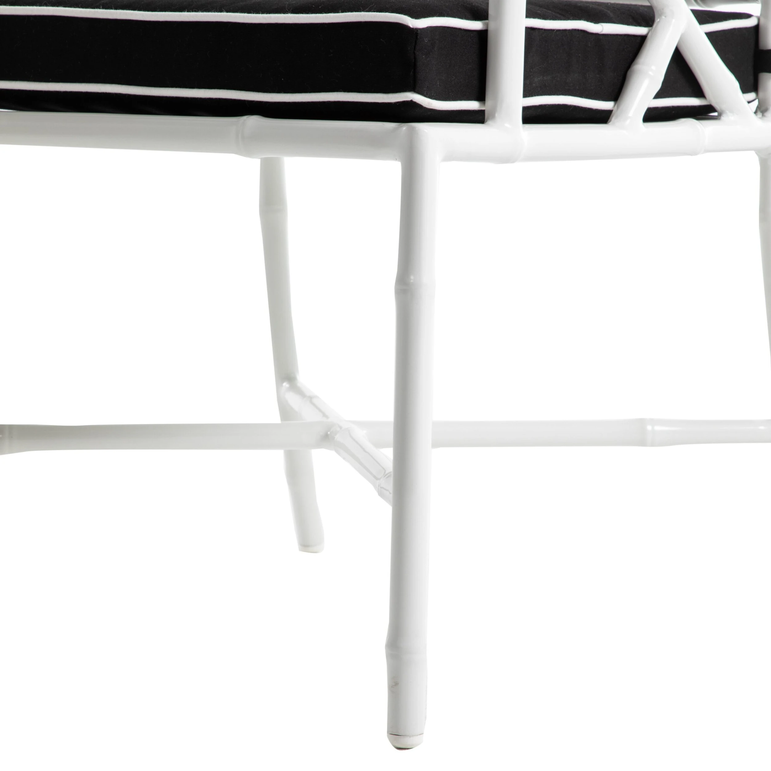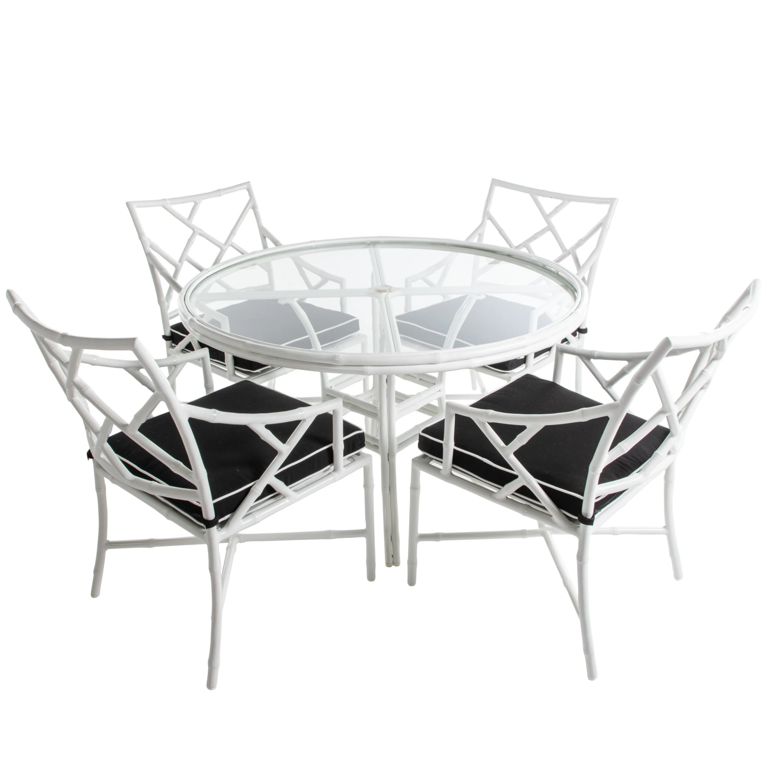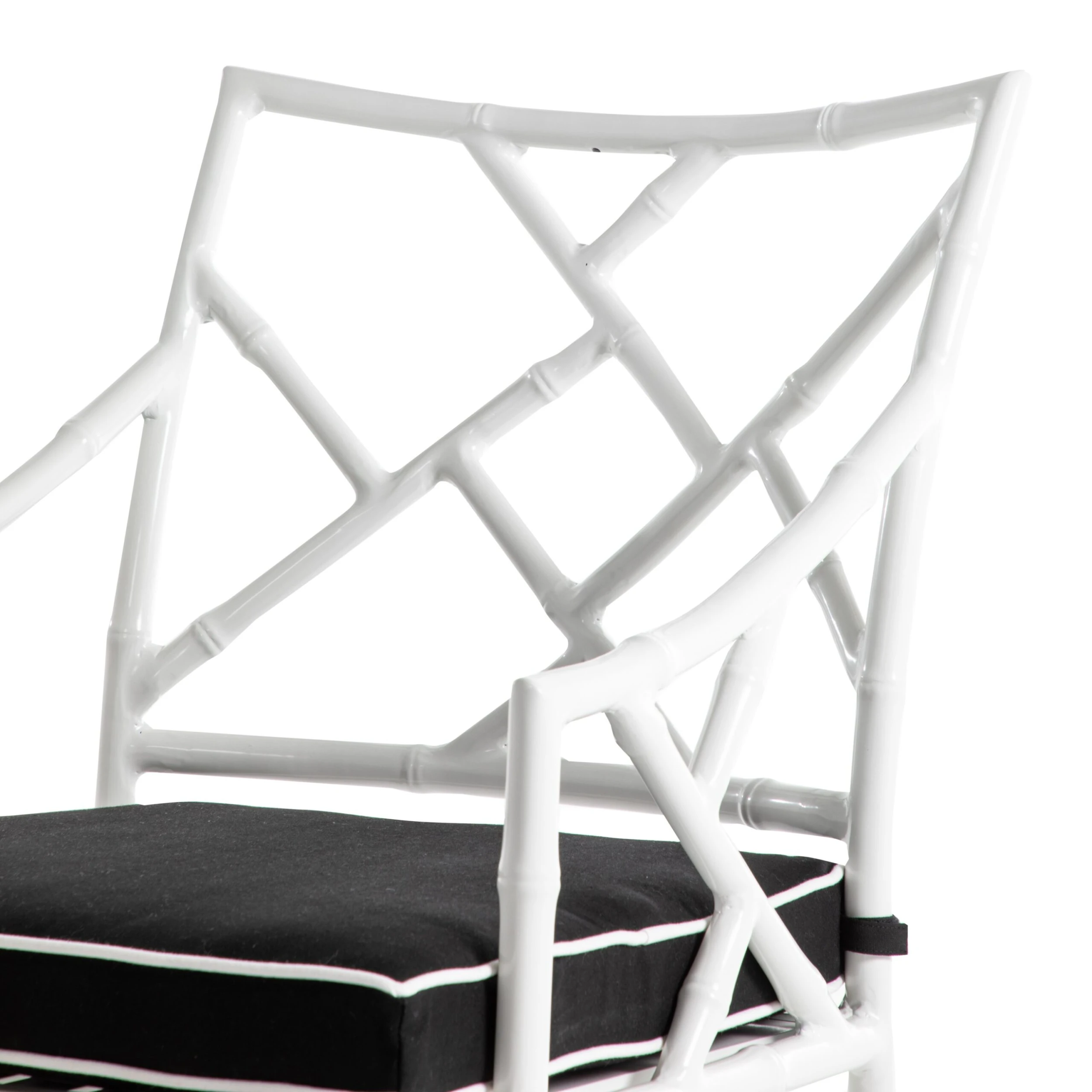 Designed in collaboration with Celerie Kemble exclusively for One Kings Lane: Offering a modern update on classic Chinese Chippendale designs, this outdoor dining set showcases impressive aluminum fretwork with a glossy white finish and double-welted upholstery filled with foam and fibers. And because each seat cushion is wrapped in durable Sunbrella–an easy-to-clean, solution-dyed acrylic fabric that is colorfast, mold-resistant, and soil-resistant–this set ensures long-lasting style, comfort, and support. The frame is crafted of wrought aluminum with interior wall supports and galvanized steel inserts, triple-hand-polished 360-degree welds, and a high-solids polyester powder-coated finish. We recommend protecting this item with an outdoor cover or storing it indoors during inclement weather.