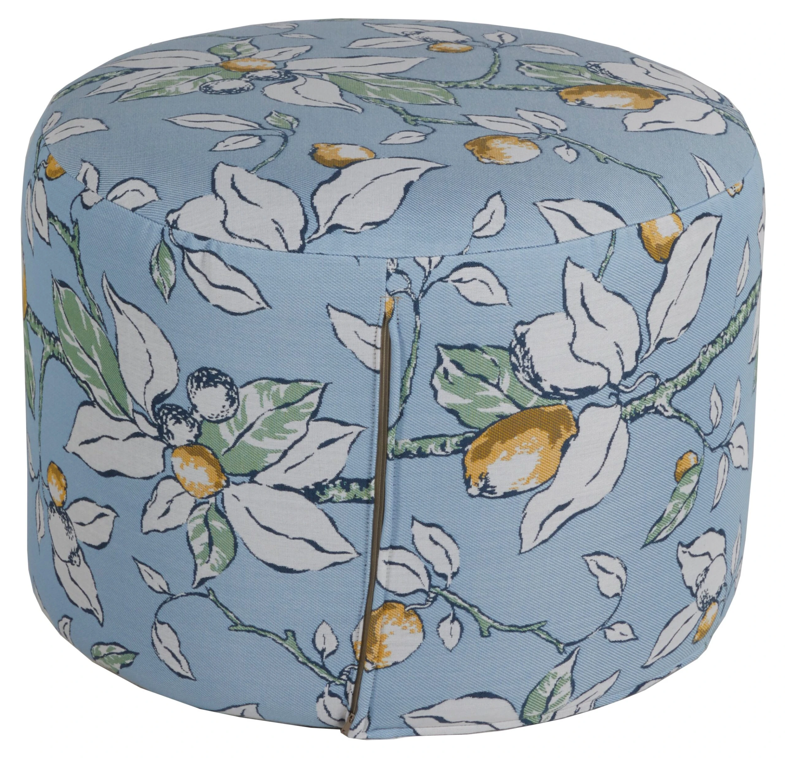 Designed in collaboration with Celerie Kemble exclusively for One Kings Lane: Perfect for perching on the patio or pool deck, with extra seating in mind or styled as a cocktail ottoman, this round pouf is wrapped in exclusive Sunbrella–an easy-to-clean, solution-dyed acrylic fabric that is colorfast, mold-resistant, and soil-resistant–and amply padded with fiber and foam. We recommend protecting this item with an outdoor cover or storing it indoors during inclement weather.