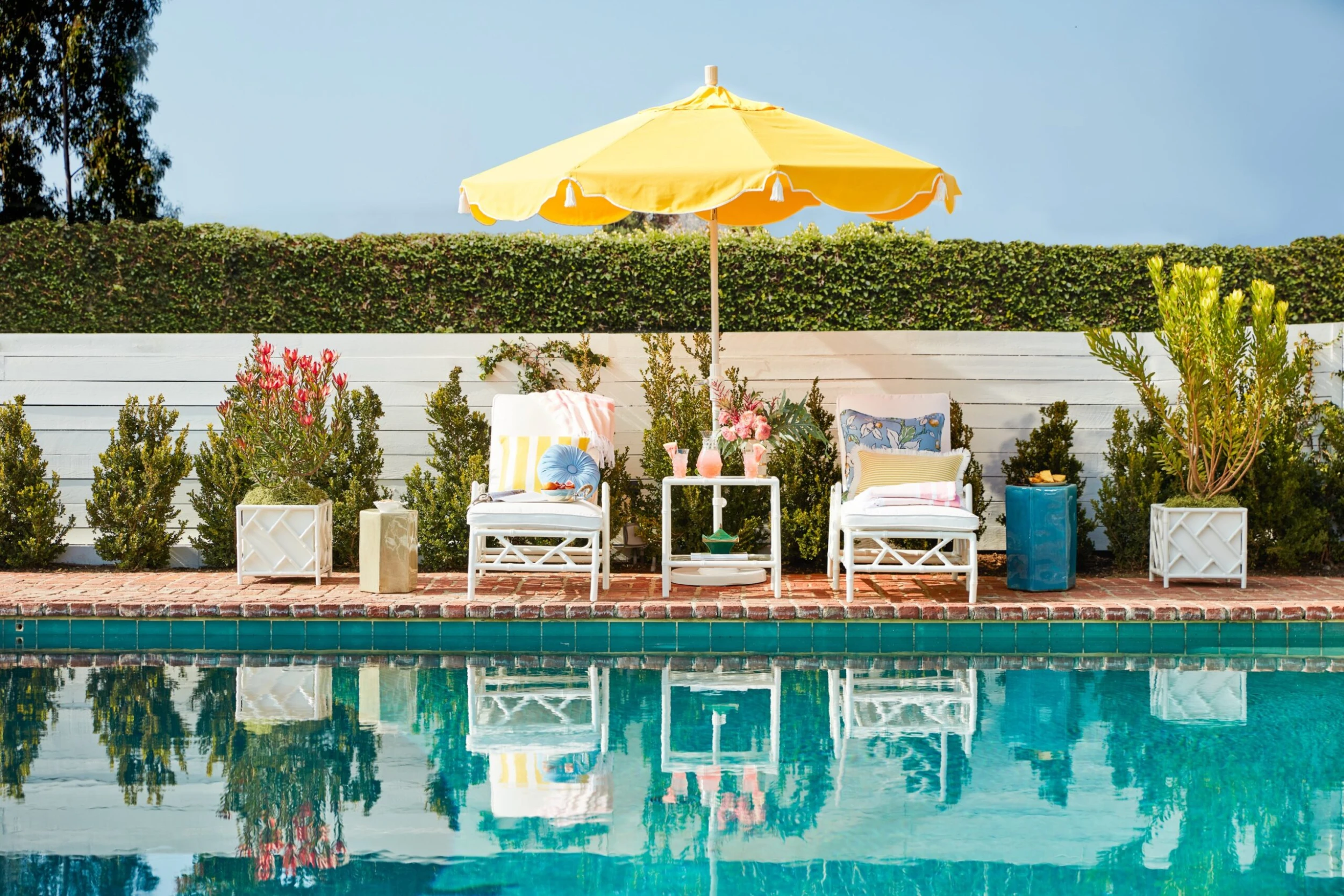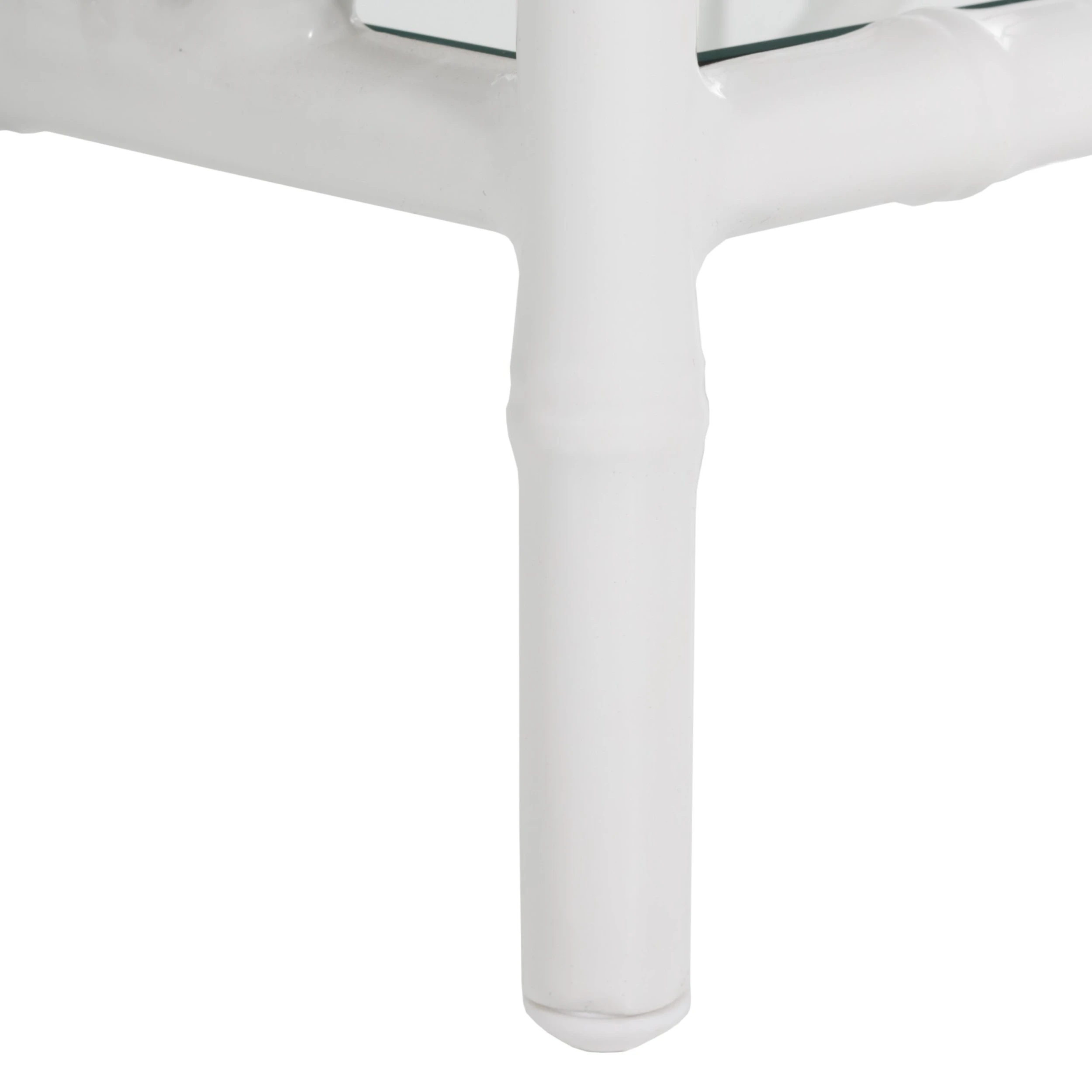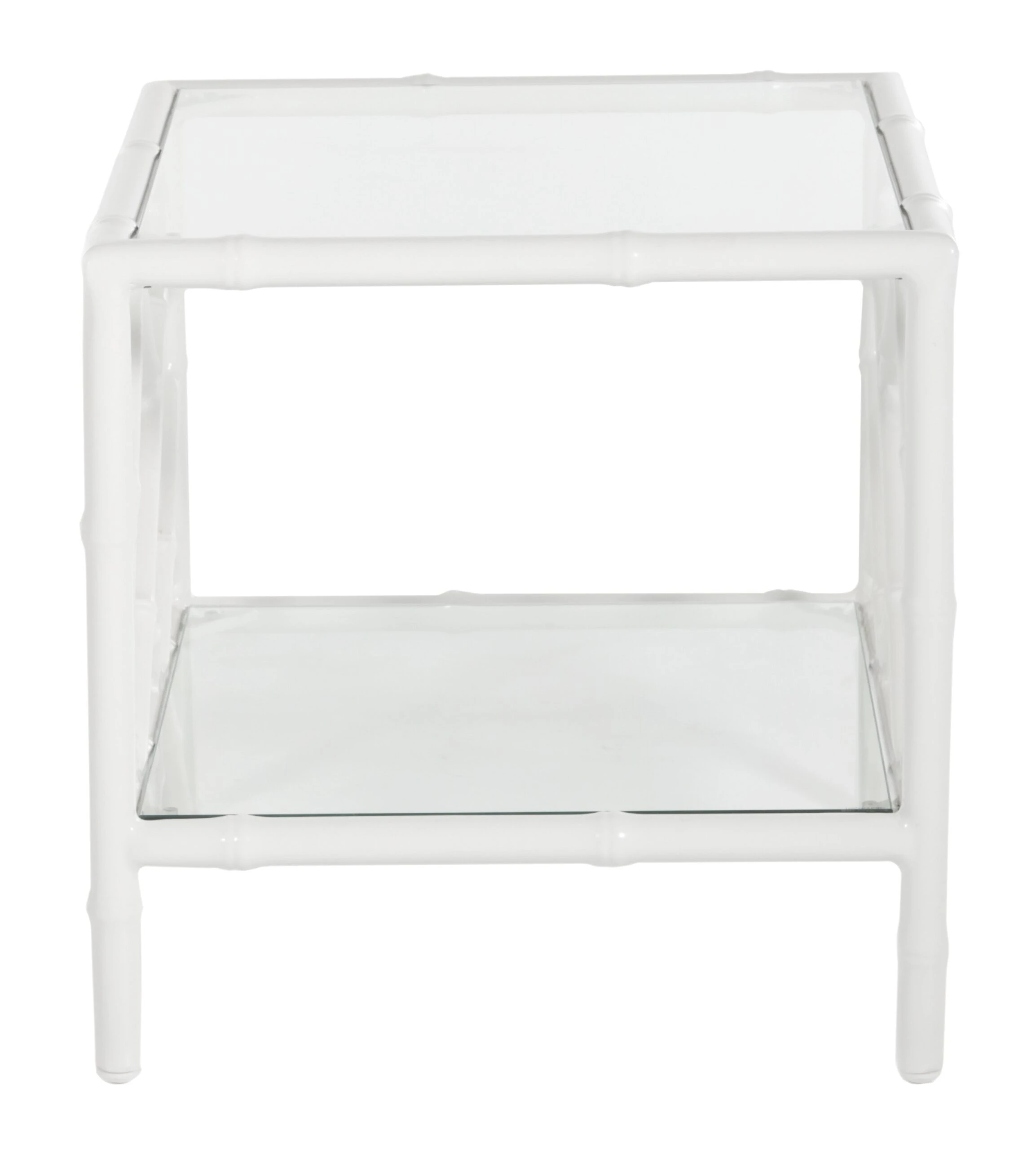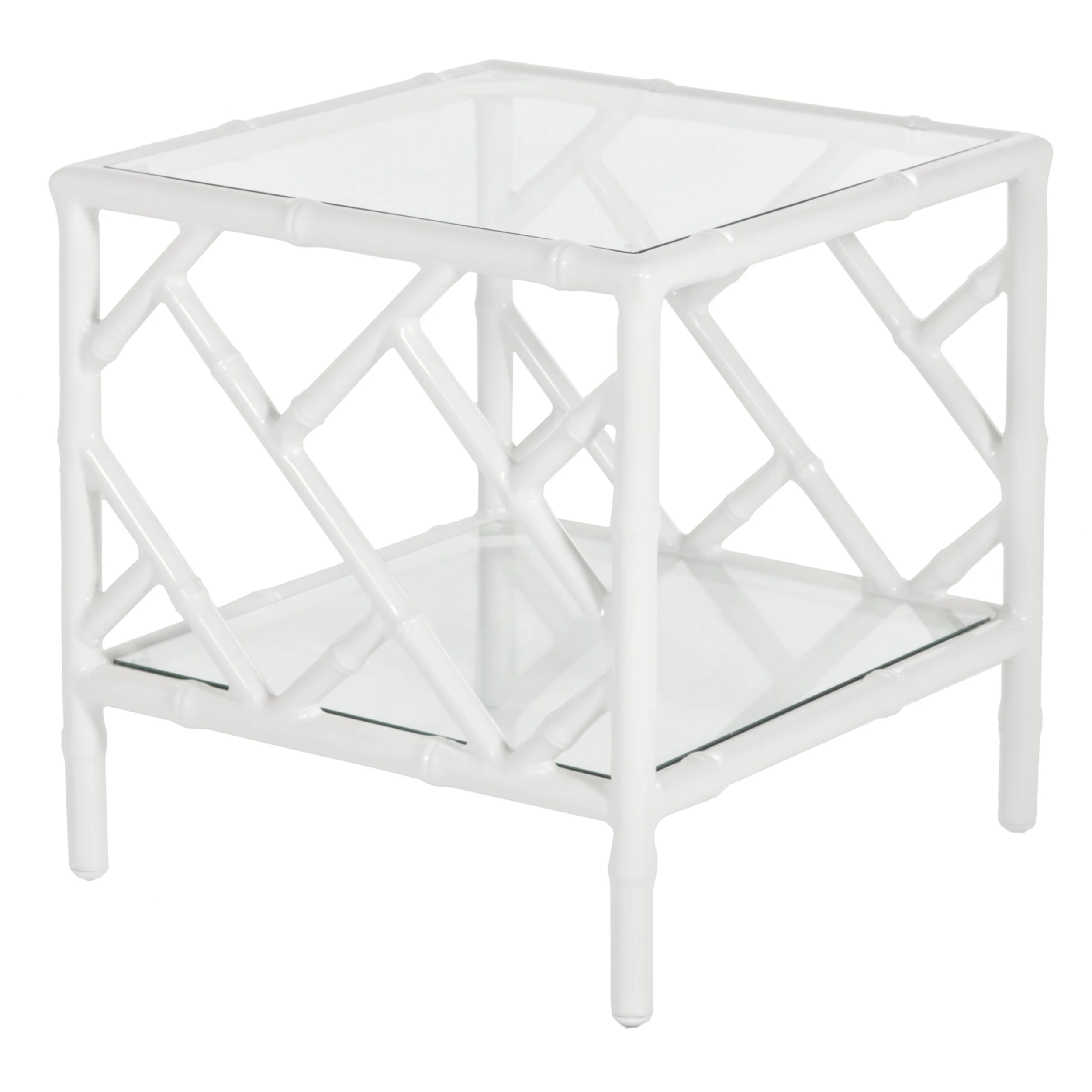 Designed in collaboration with Celerie Kemble exclusively for One Kings Lane: Offering a modern update on classic Chinese Chippendale designs, this outdoor side table showcases aluminum fretwork with a glossy white finish. The tempered-glass top and shelf provide plenty of sturdy space for resting drinks and stashing sunscreen, magazines, and other must-haves.