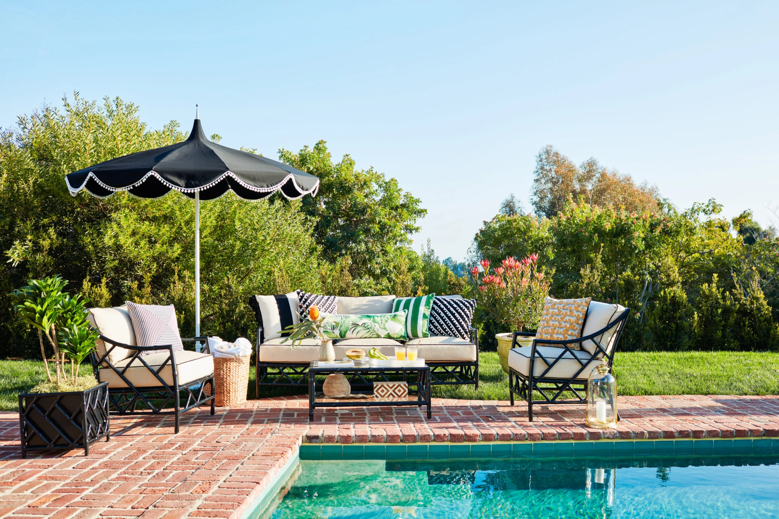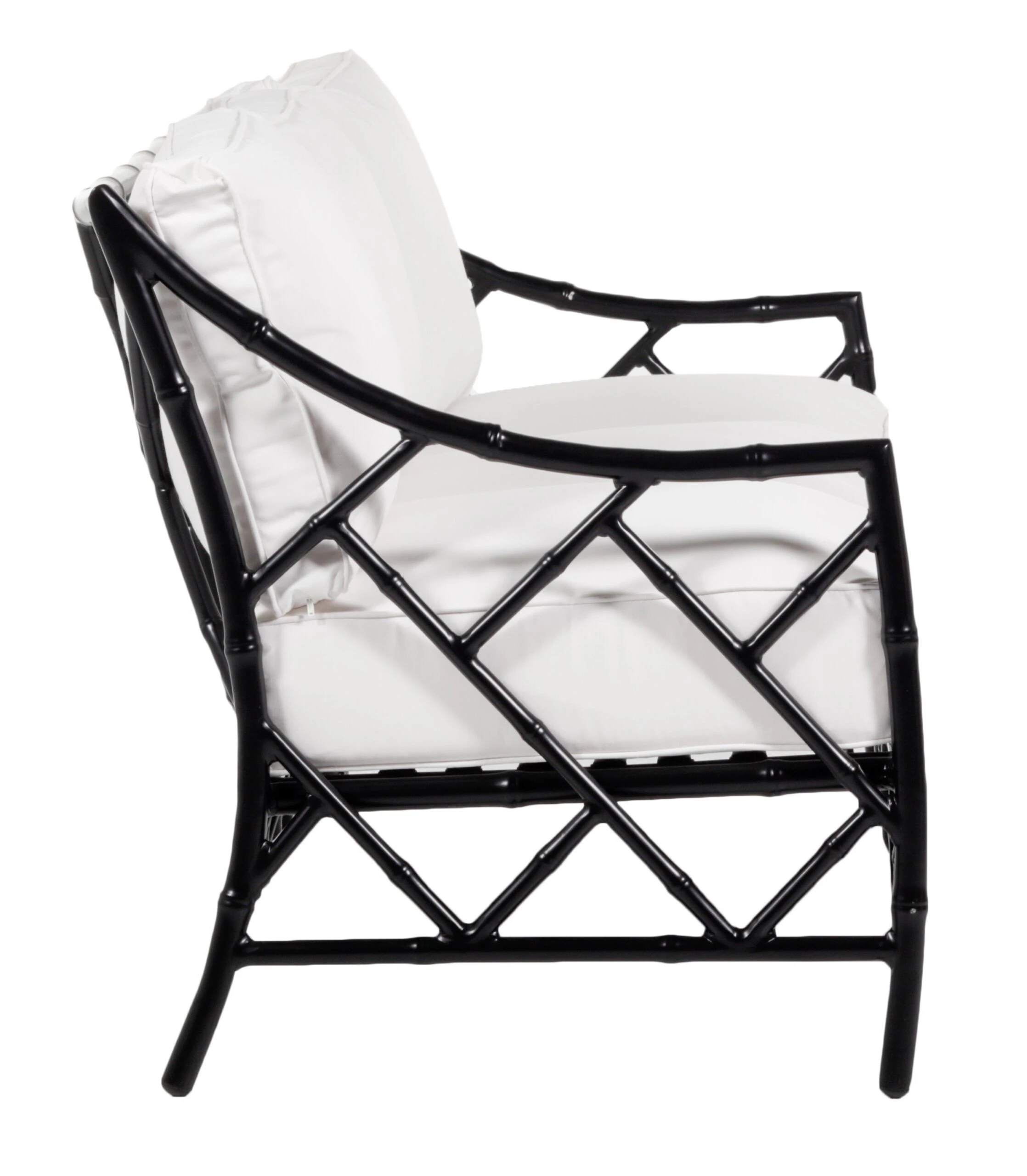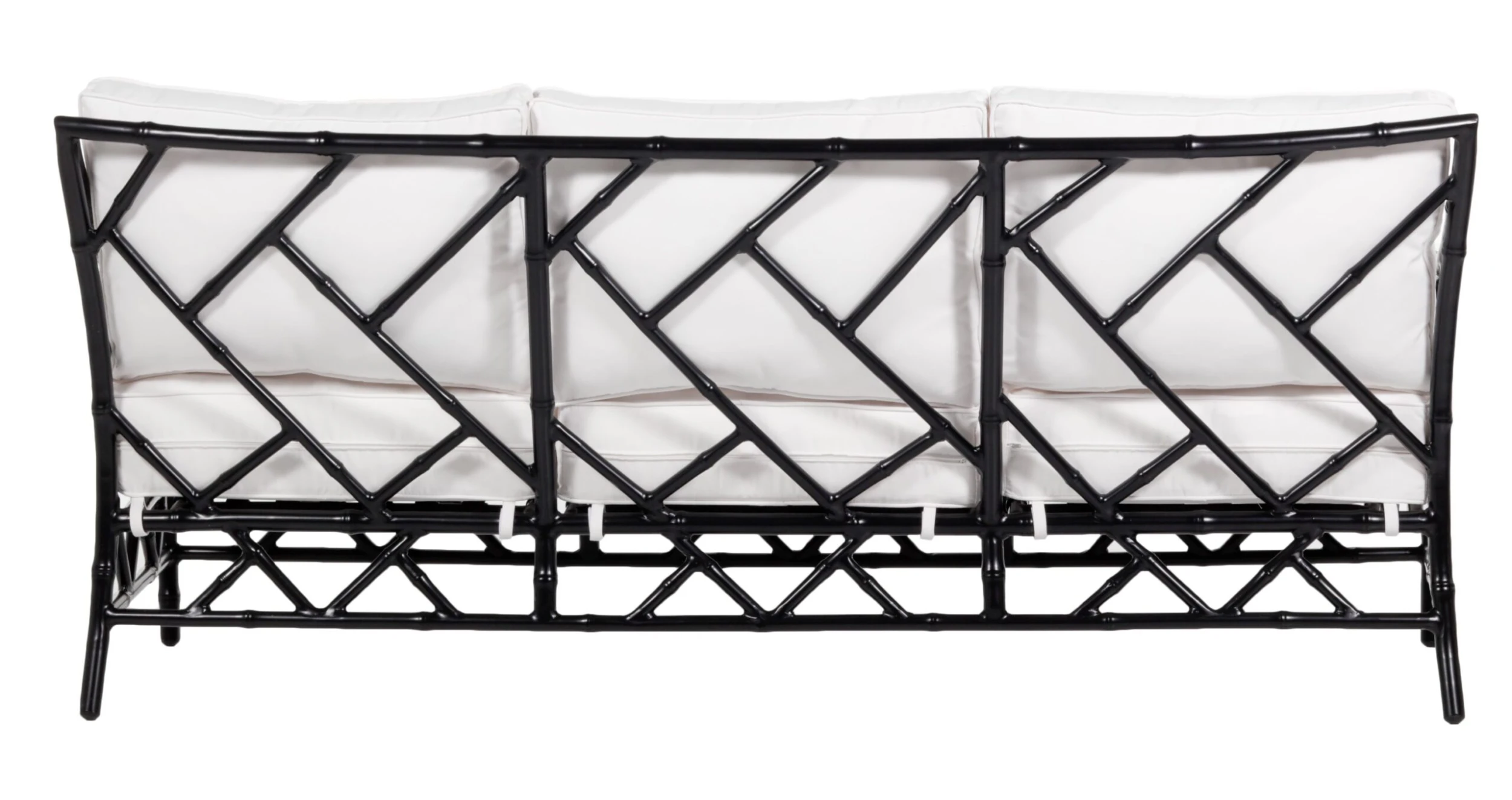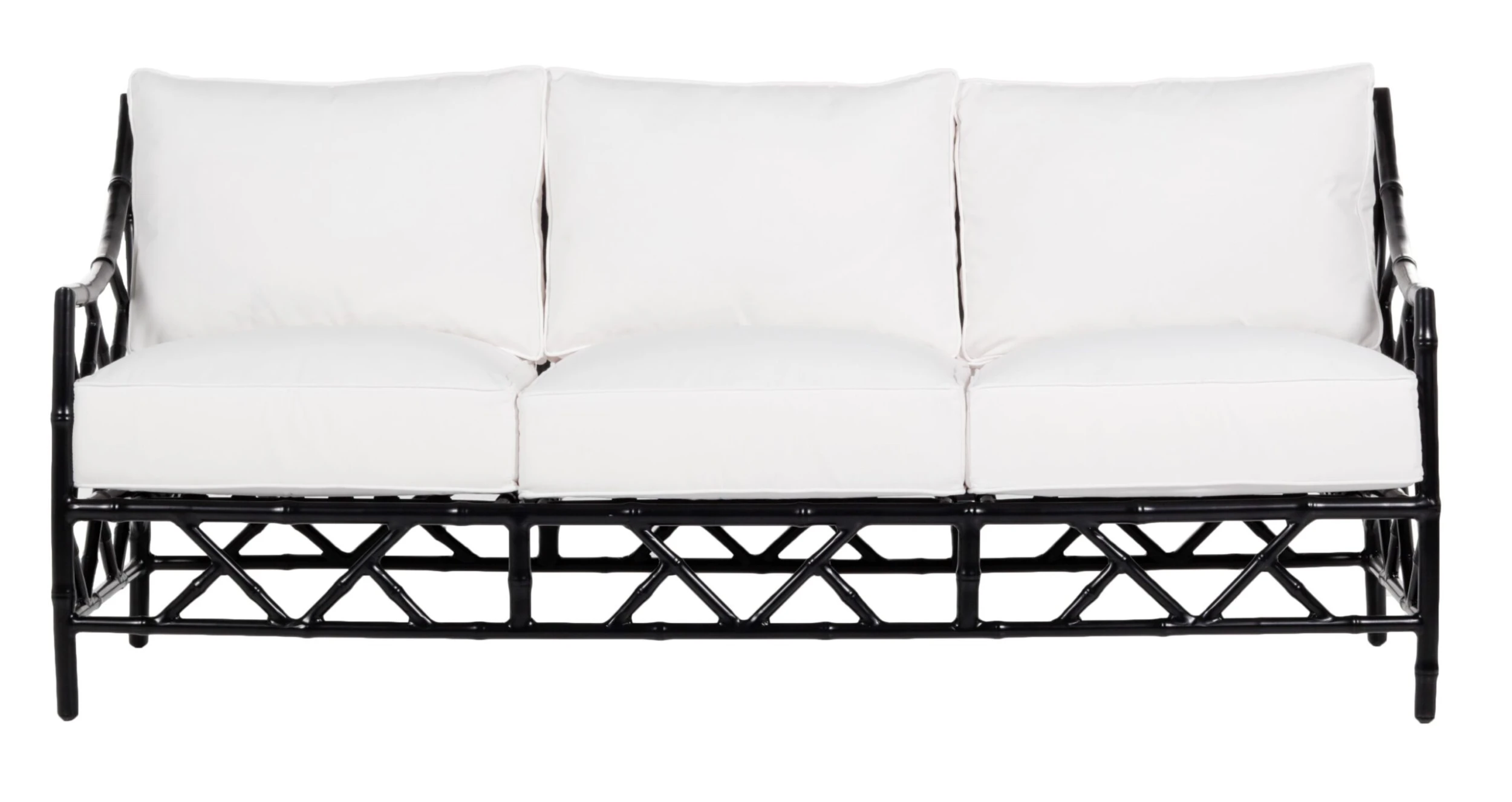 Designed in collaboration with Celerie Kemble exclusively for One Kings Lane: Offering a modern update on classic Chinese Chippendale designs, this outdoor sofa showcases impressive aluminum fretwork with a black finish and double-welted upholstery filled with foam and fibers.