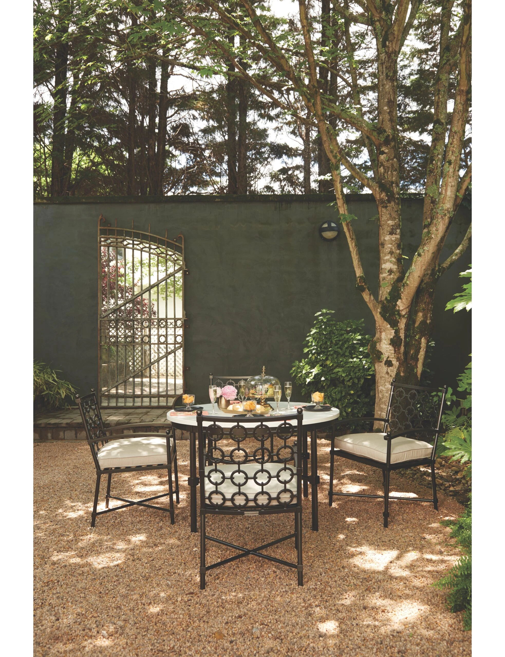 A stylish addition to your outdoor space, this armchair features a powder-coated aluminum frame with a repeating circle motif and slender, tapered arms. Its amply filled cushion is wrapped in durable, easy-to-clean, solution-dyed acrylic fabric with self-welting.