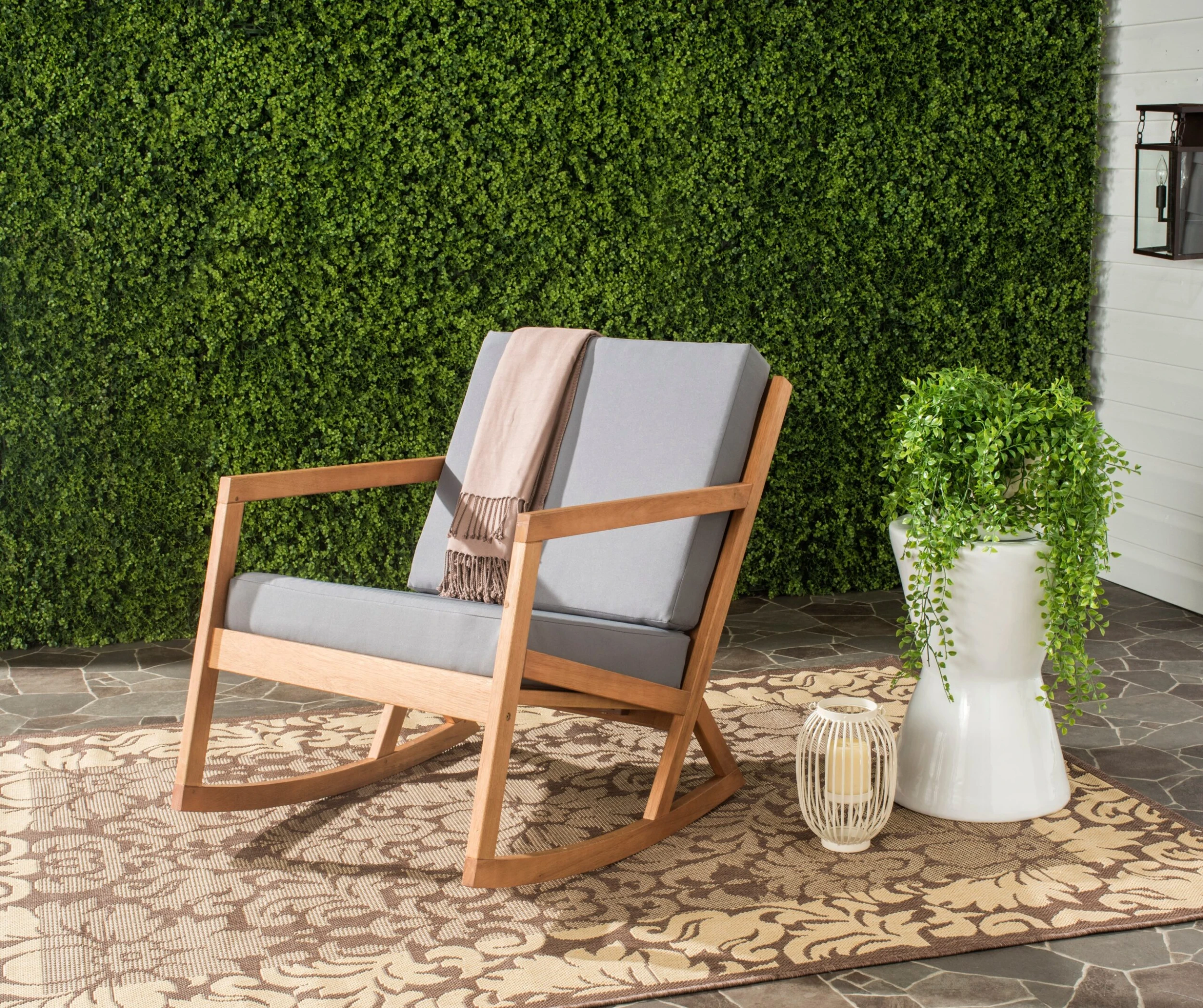 Framed in richly figured acacia coated in a warm brown finish, this clean-lined rocking chair feels right at home on the porch or pool deck. Topped with a gray seat cushion for added style and support.