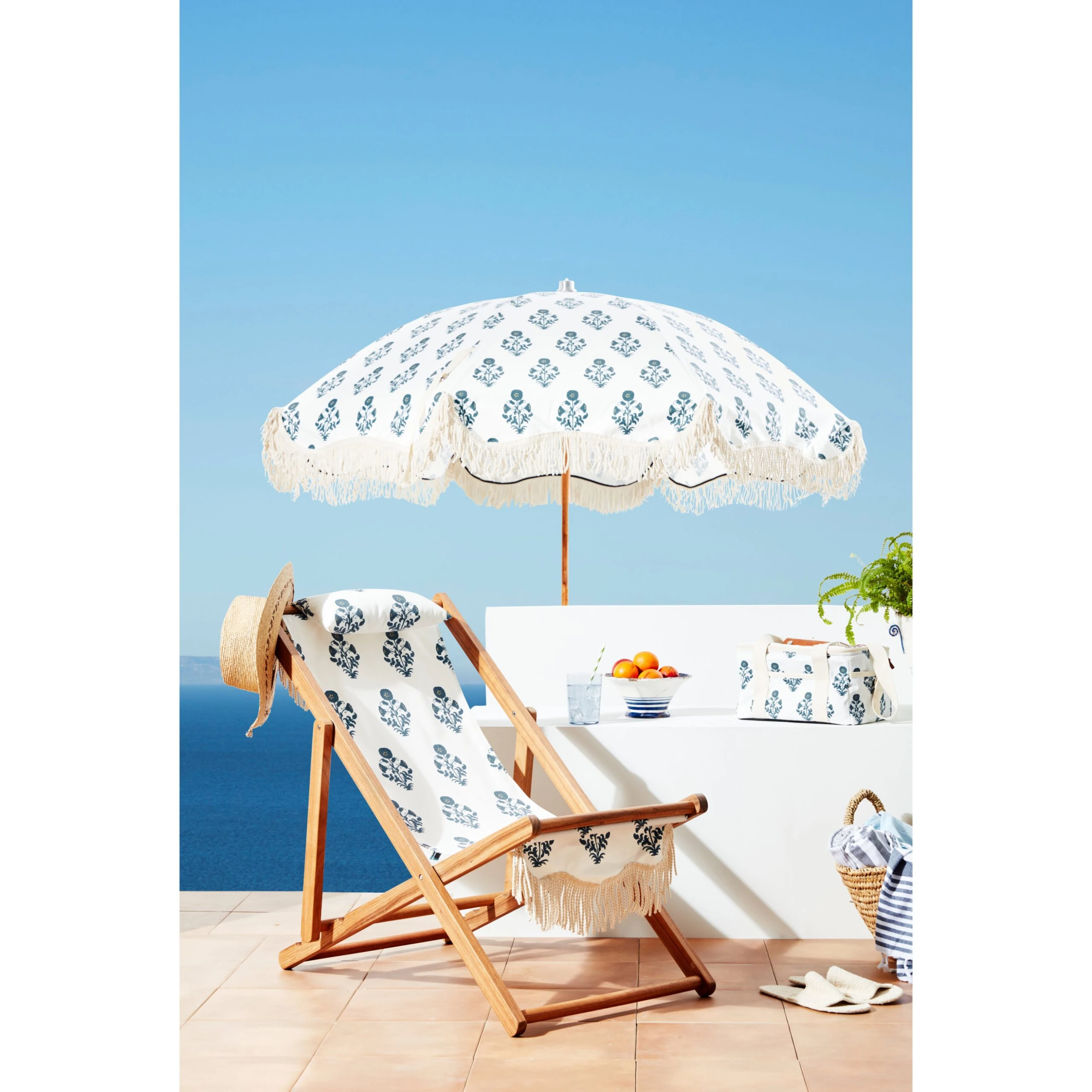 Designed exclusively for One Kings Lane: Perfect for the beach, lake, or deck, this umbrella is designed with a coated canvas canopy that’s conveniently UV-, mold-, and water-resistant. A collapsible pole makes it possible to tilt to block the sun from any direction and its screw tip bottom helps to anchor it into the sand (6′ of shade when open). Playful cotton fringe completes the look, while a coordinating carrying bag makes it easy to transport.