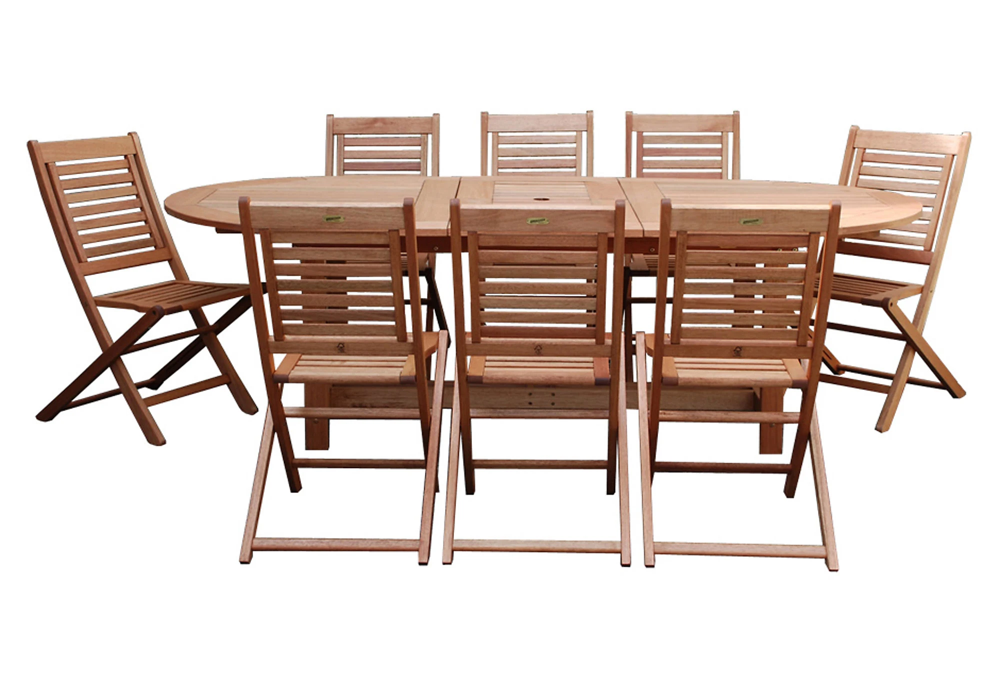 We love the clean, classic look of this set–it will complement nearly any outdoor setting. Crafted from FSC-certified eucalyptus, using traditional (and highly durable) mortise-and-tenon joinery, it includes a slatted extension table and eight matching chairs.