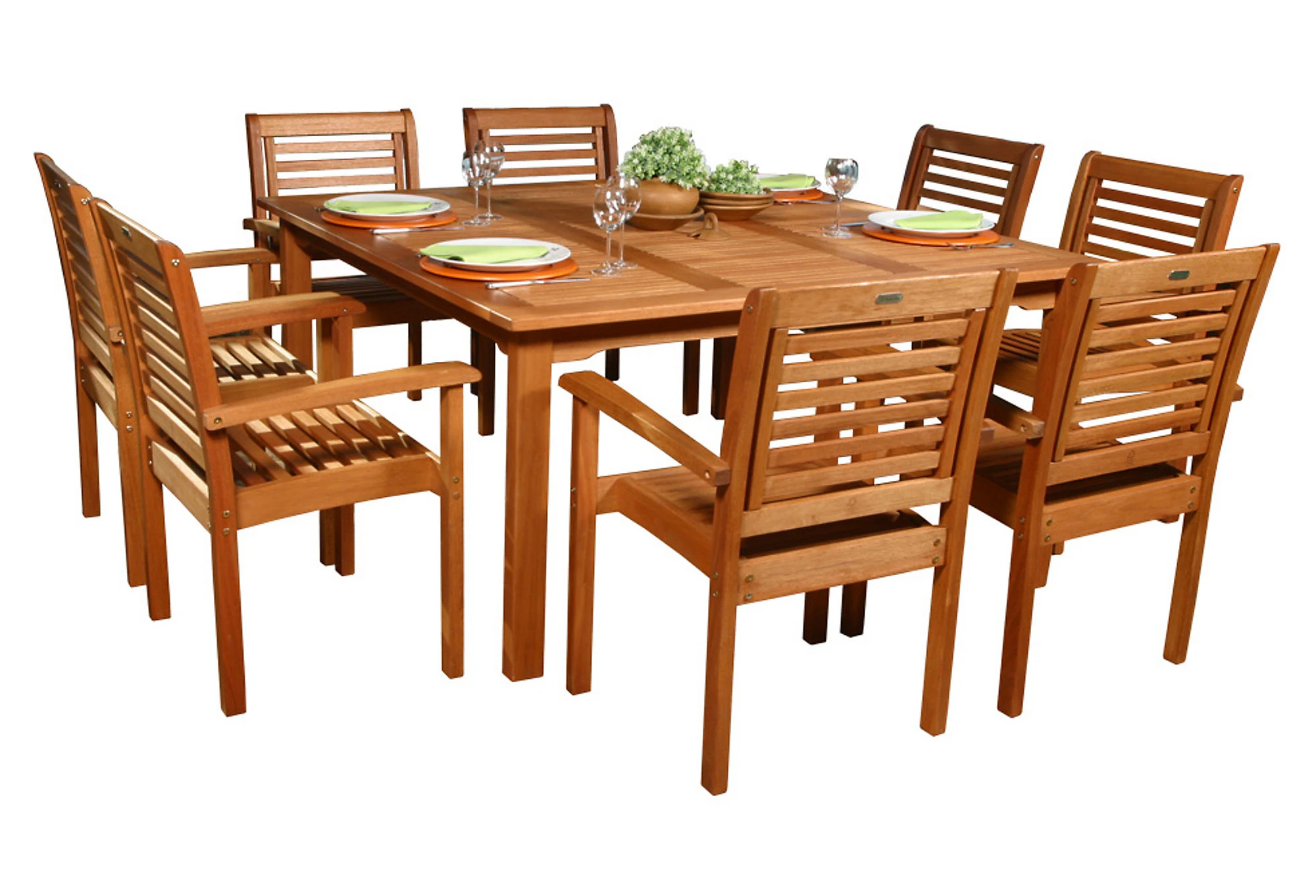 We love the clean, classic look of this set–it will complement nearly any setting. It’s crafted from FSC-certified eucalyptus wood and it includes a table and eight chairs.