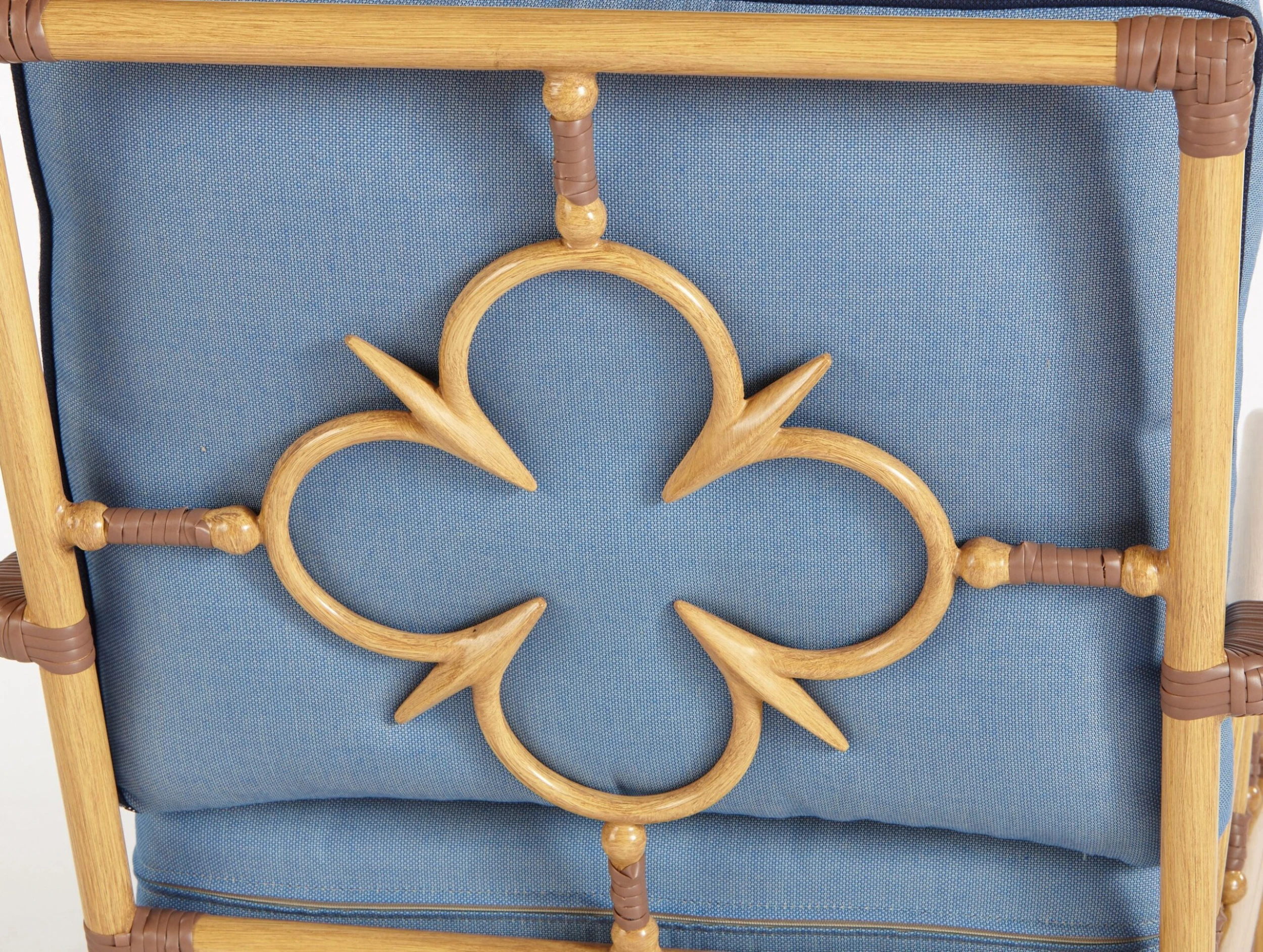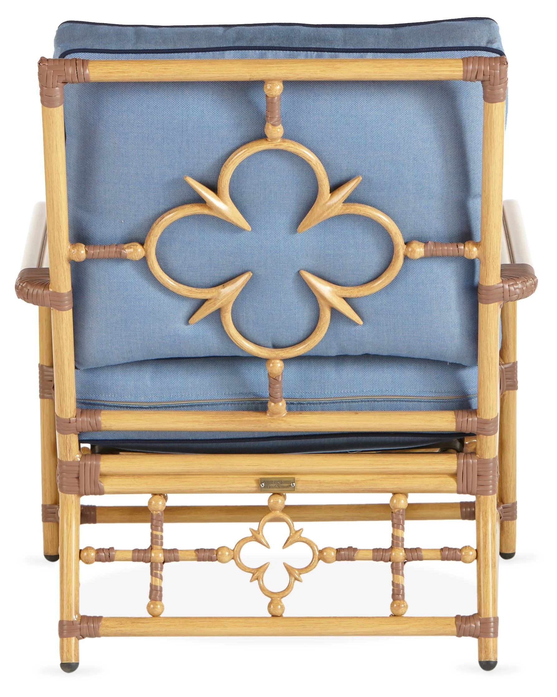 Exclusive to One Kings Lane: Boasting UV- and weather-resistant Sunbrella upholstery, an aluminum frame, and handwoven fiber reinforcements, this handsome lounge chair is built to last. Ample padding ensures a comfortable seat, while delicate quatrefoil motifs and a navy welt finish the look in high style.