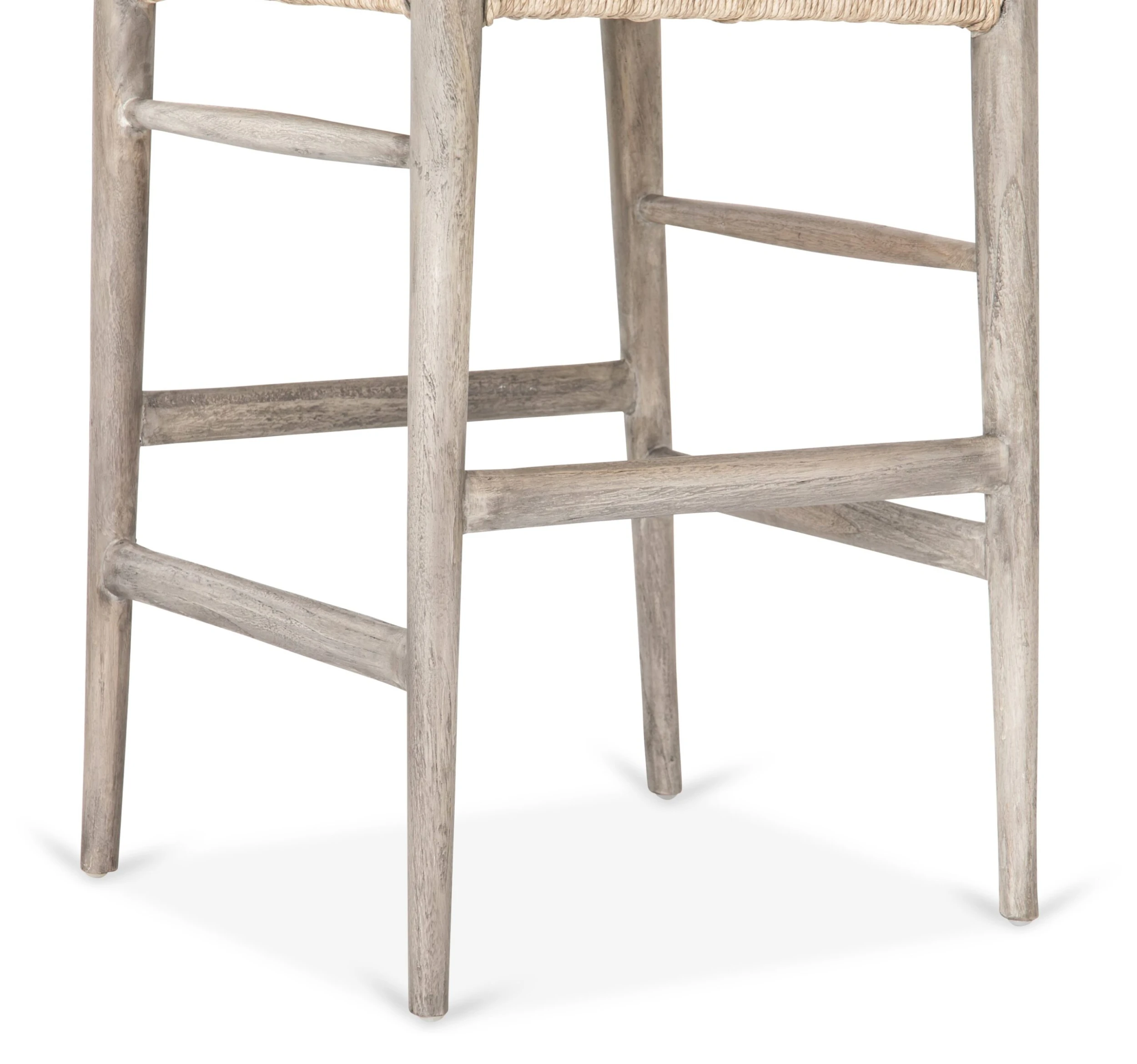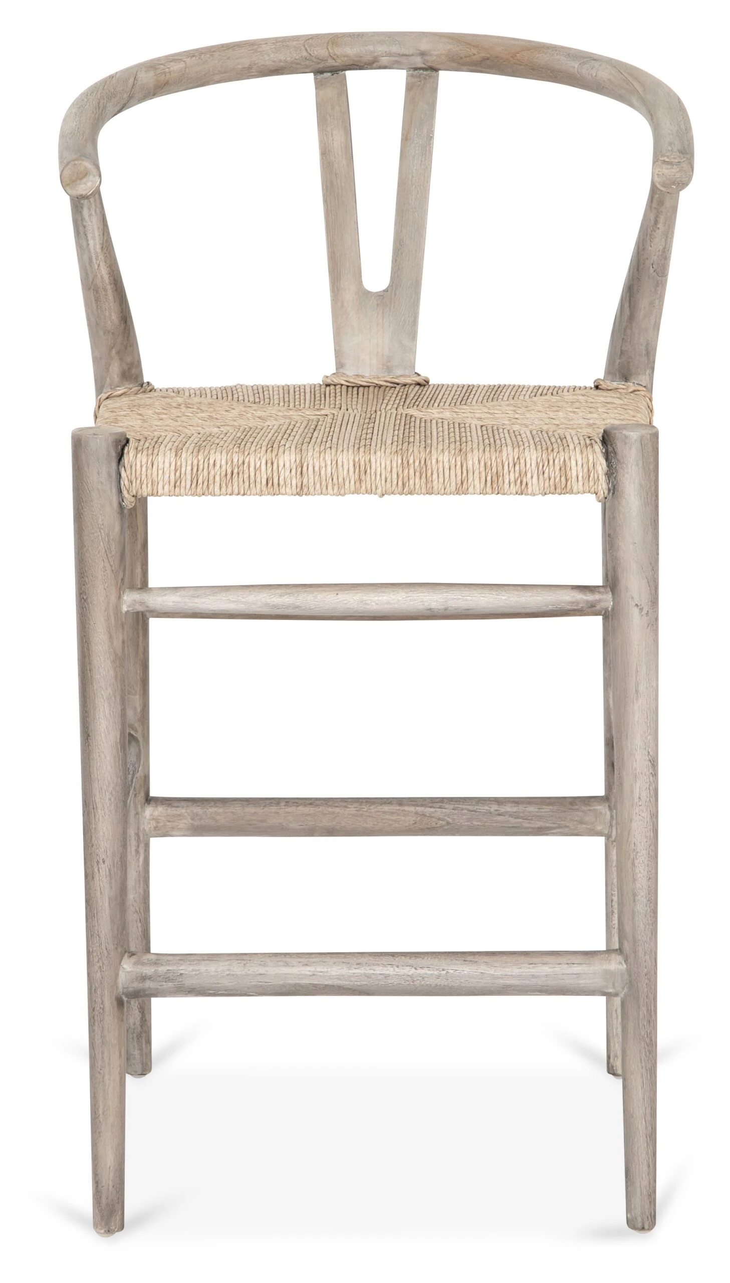 Suitable for any outdoor space, this midcentury-inspired counter stool is framed in teak—a moisture-resistant hardwood that resists warping, cracking, and decay—with a curved wishbone back, intricately woven seat, and weathered gray finish that celebrates the beauty of the wood’s grain.