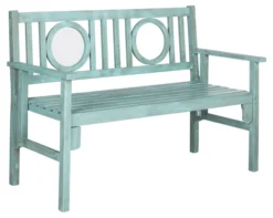 Crafted of acacia–a hardwood prized for its durability and moisture-resistance–and fashioned with mortise-and-tendon joint construction, this slatted outdoor bench will last you for seasons to come. Detailed with a geometric back splat and a refreshing blue hue.