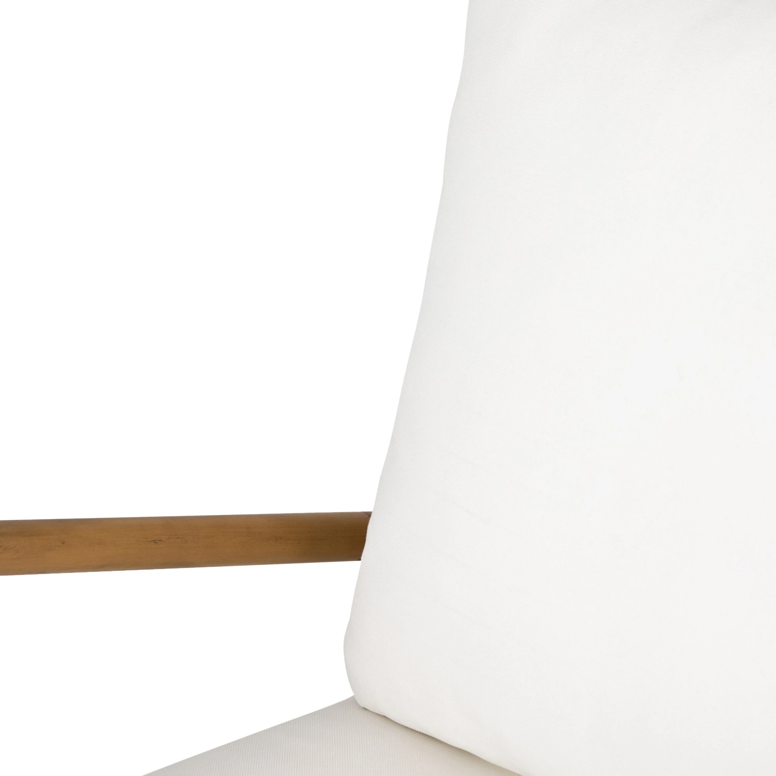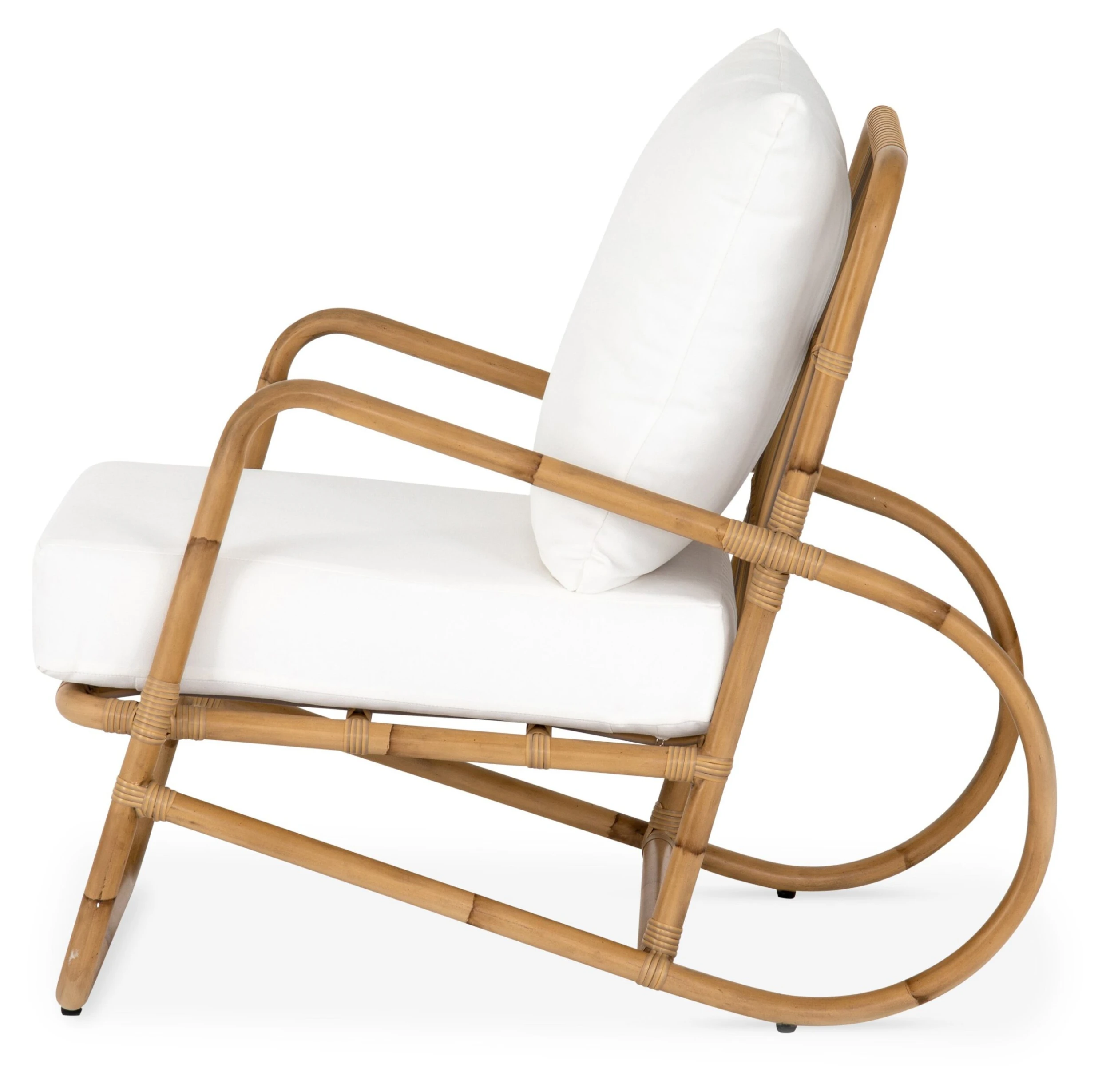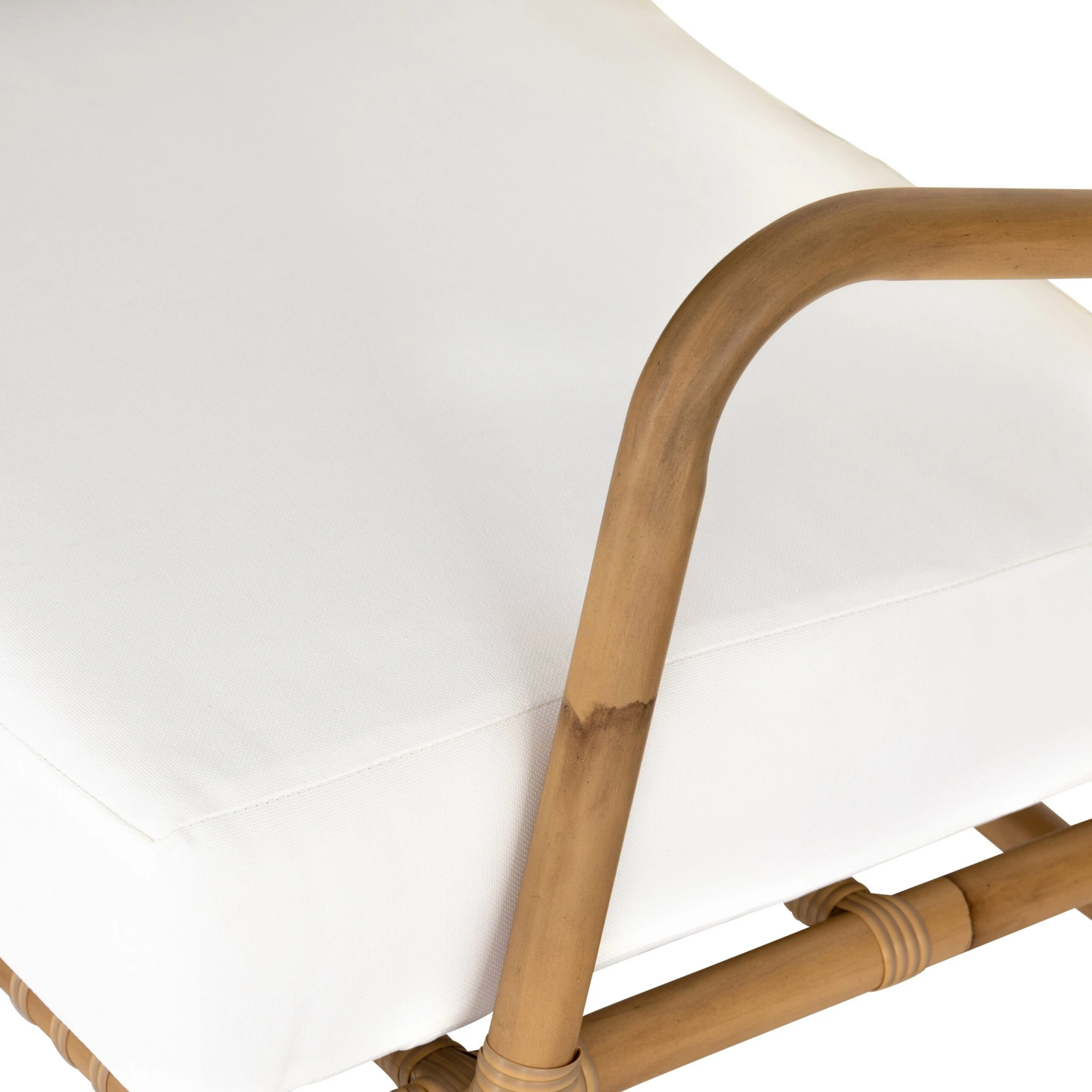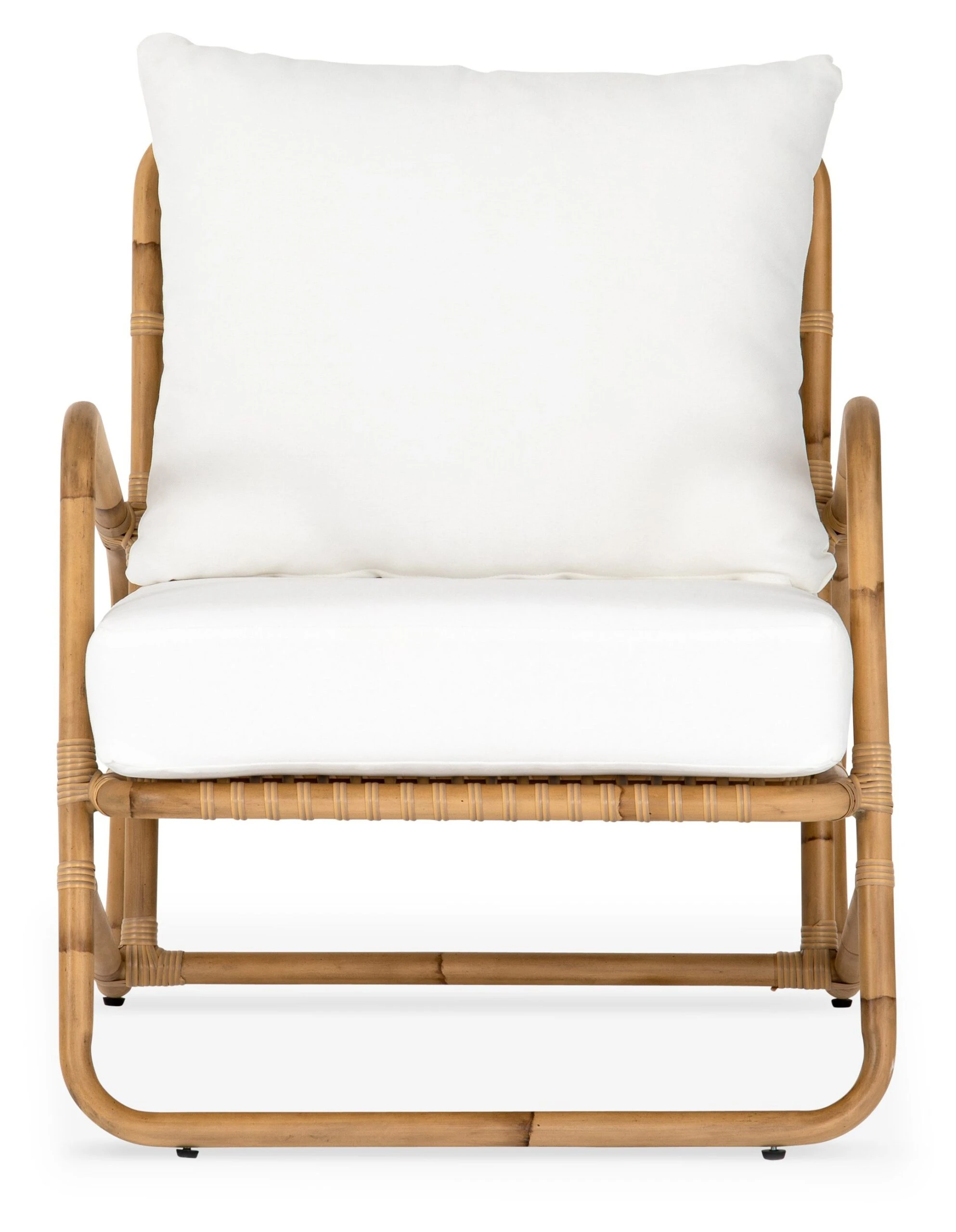 Though the frame of this armchair appears to be made of rattan and rope, it’s actually crafted of weather-resistant aluminum and synthetic wicker. The amply filled cushions, covered in colorfast, mildew-resistant fabric, ensure optimal comfort.