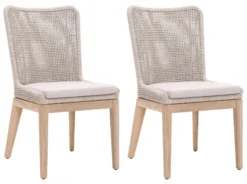 Framed in teak—a moisture-resistant hardwood that is also resistant to warping, swelling, and shrinking—with intricately woven rope details, these textural side chairs are sure to stand out on the porch or patio. All-weather cushions filled with foam ensure a comfortable seat.