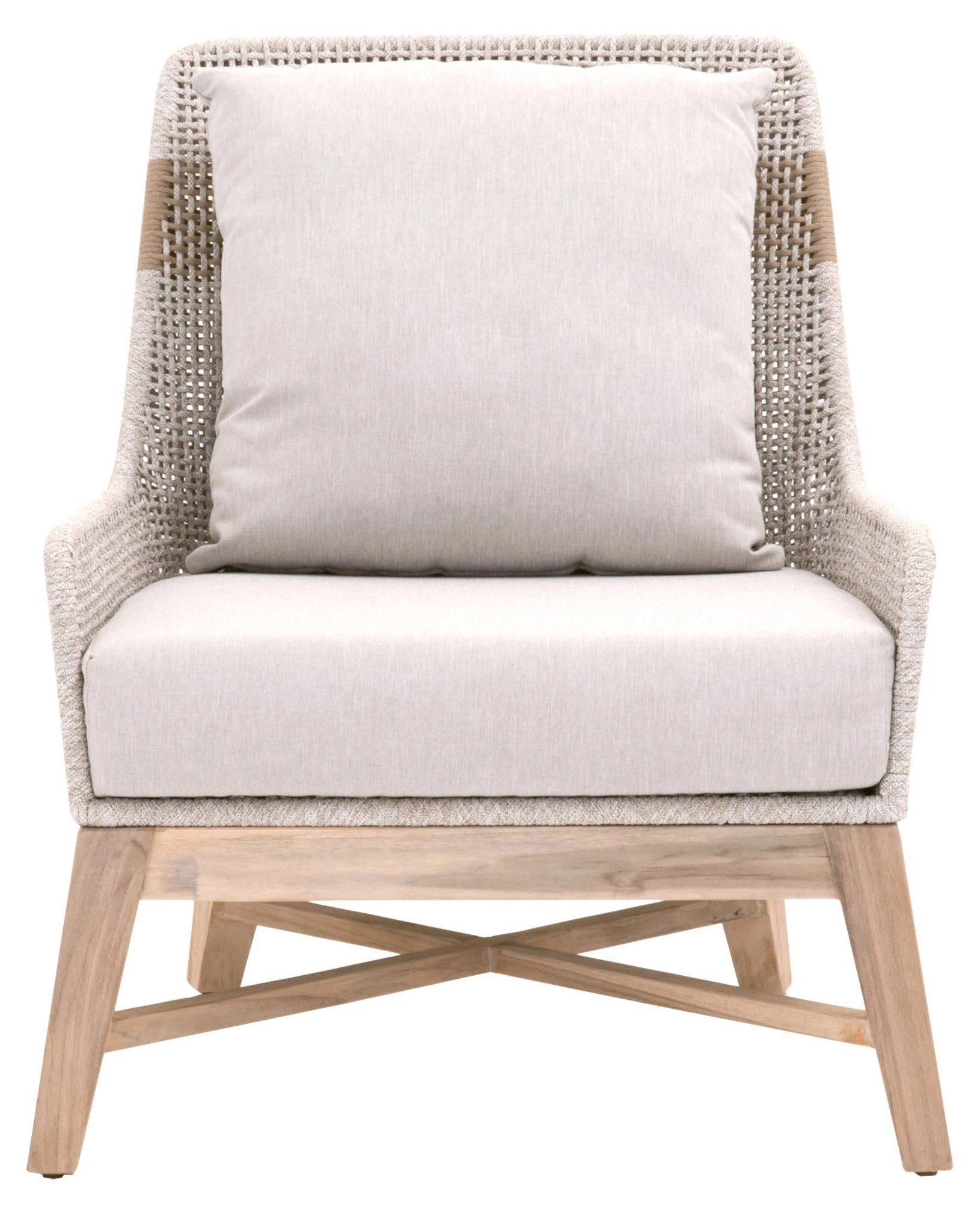 Framed in aluminum and teak—a moisture-resistant hardwood that is also resistant to warping, swelling, and shrinking—with intricately woven rope details, this textural club chair is sure to stand out on the porch or patio. All-weather cushions filled with foam ensure a comfortable seat.