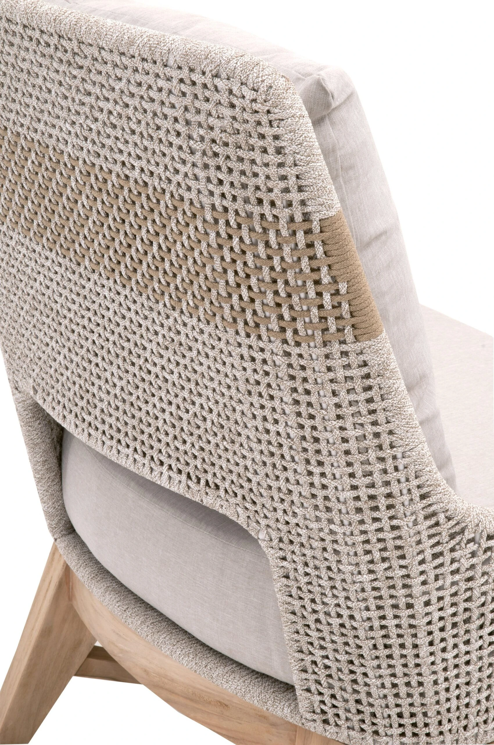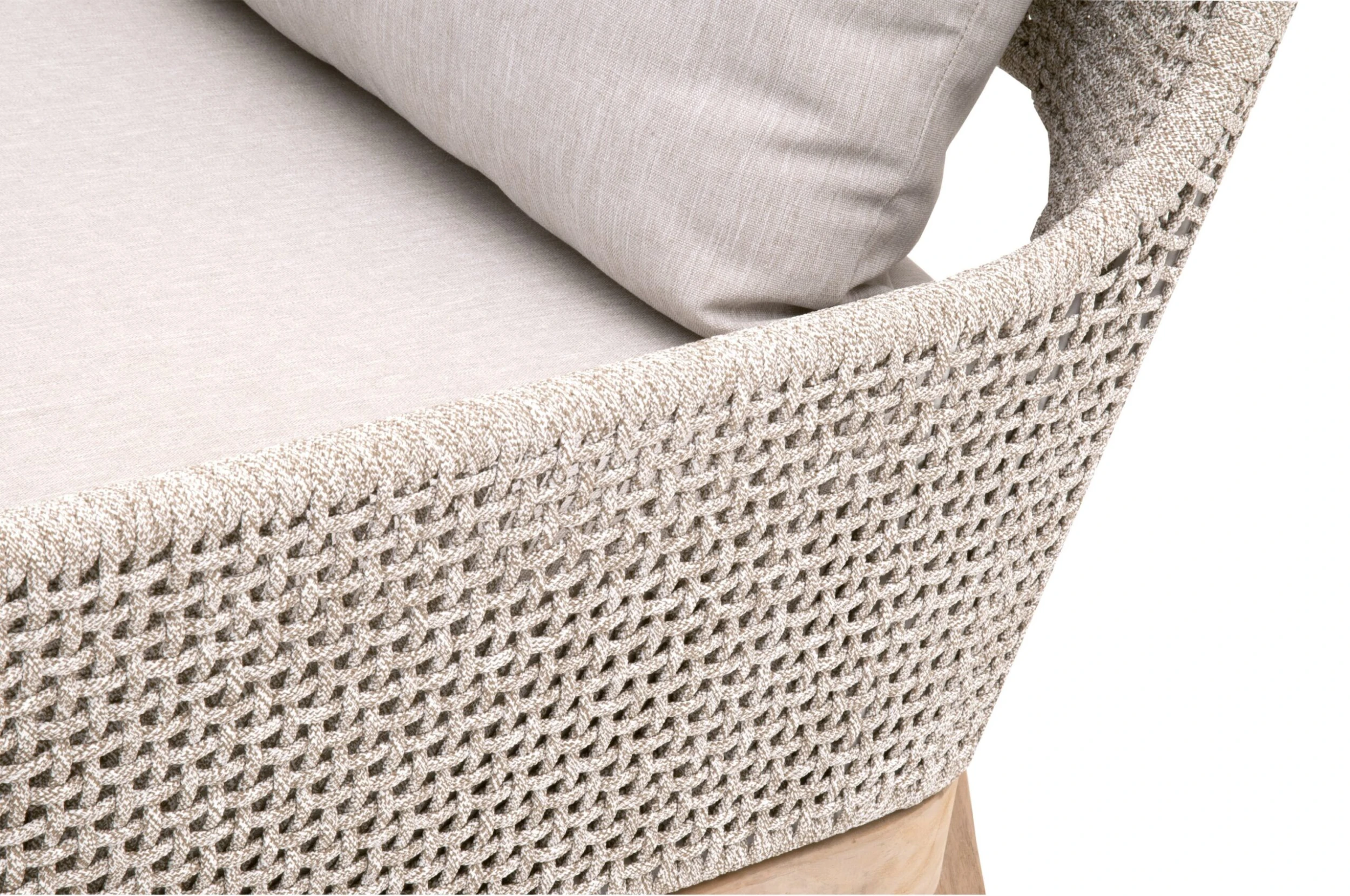 materials: frame, teak/aluminum/polyolefin rope; upholstery, olefin; fill, foam