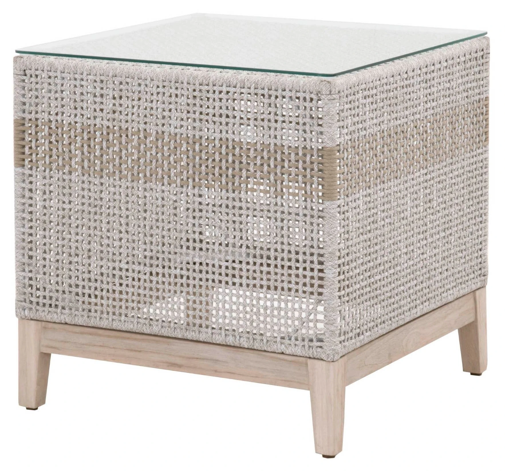 Framed in aluminum and teak—a moisture-resistant hardwood that is also resistant to warping, swelling, and shrinking—with intricately woven rope details, this textural side table is sure to stand out on the porch or patio. A glass top provides a smooth surface for placing drinks, snacks, and accents.